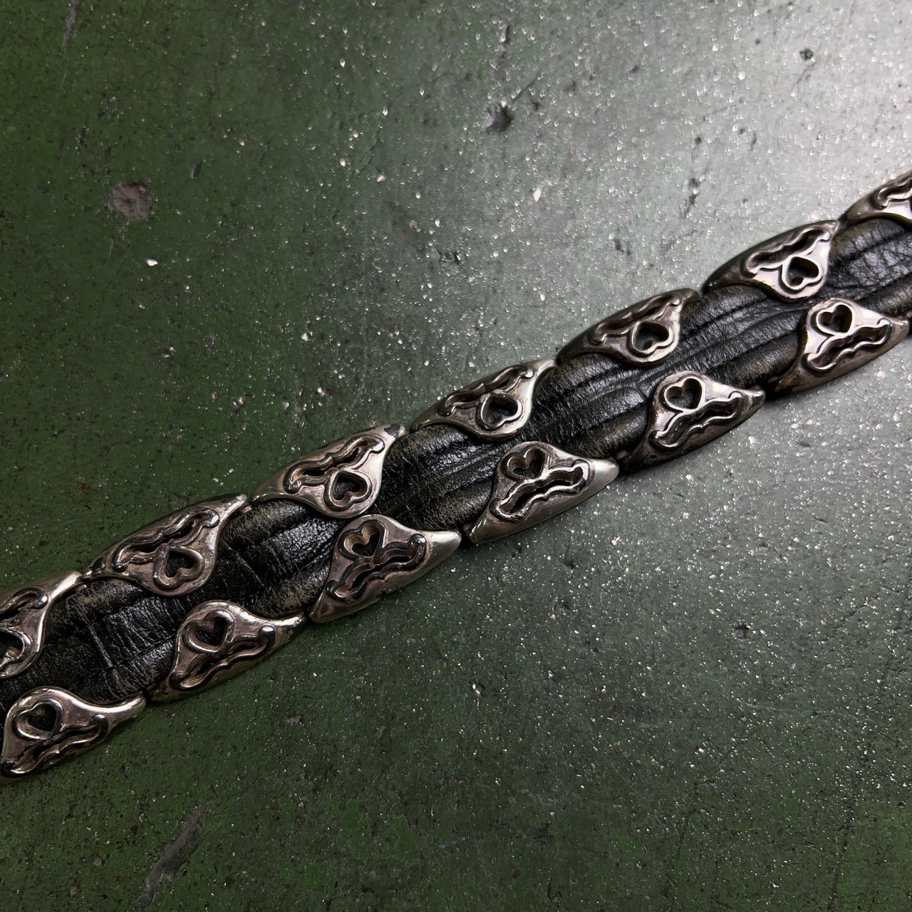 金具が大量に付いた厳つい仕様のウエスタンレザーベルト。レザーベルトにここまで金具を取り付けるのもすごい。