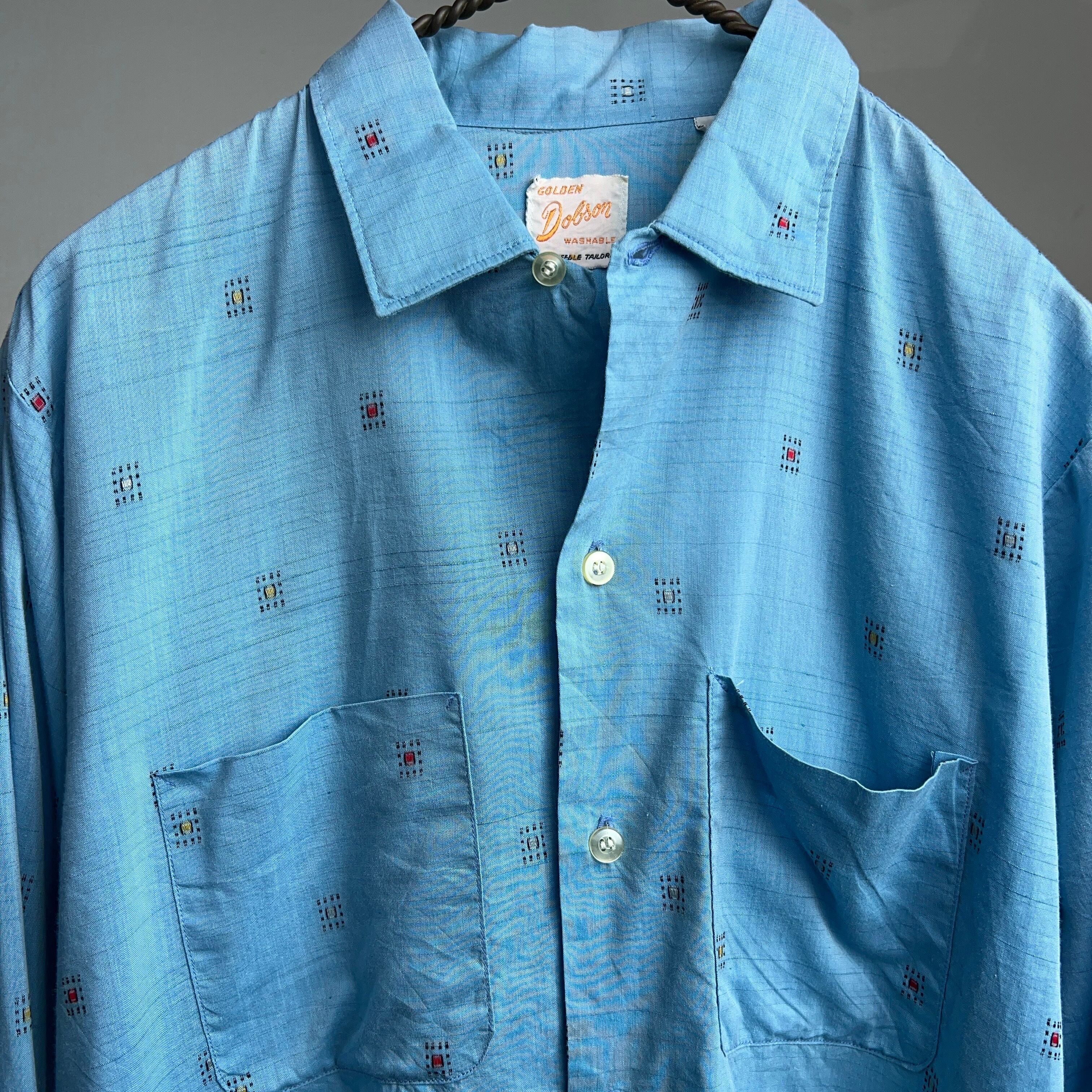 1960's Golden Dobson L/S Shirt 60年代 ボックスカット 長袖シャツ 総柄 ネップ 絣 水色 【1000A3258】【送料無料】