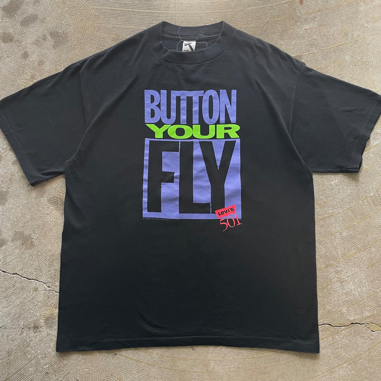 シングルステッチ、Made in USA の90年代のリーバイス「ボタン・ユア・フライ」Tシャツ。大胆なグラフィックと鮮やかなカラーリングが特徴で、ストリート好きにもアメカジ好きにも刺さる1着ではないでしょうか。