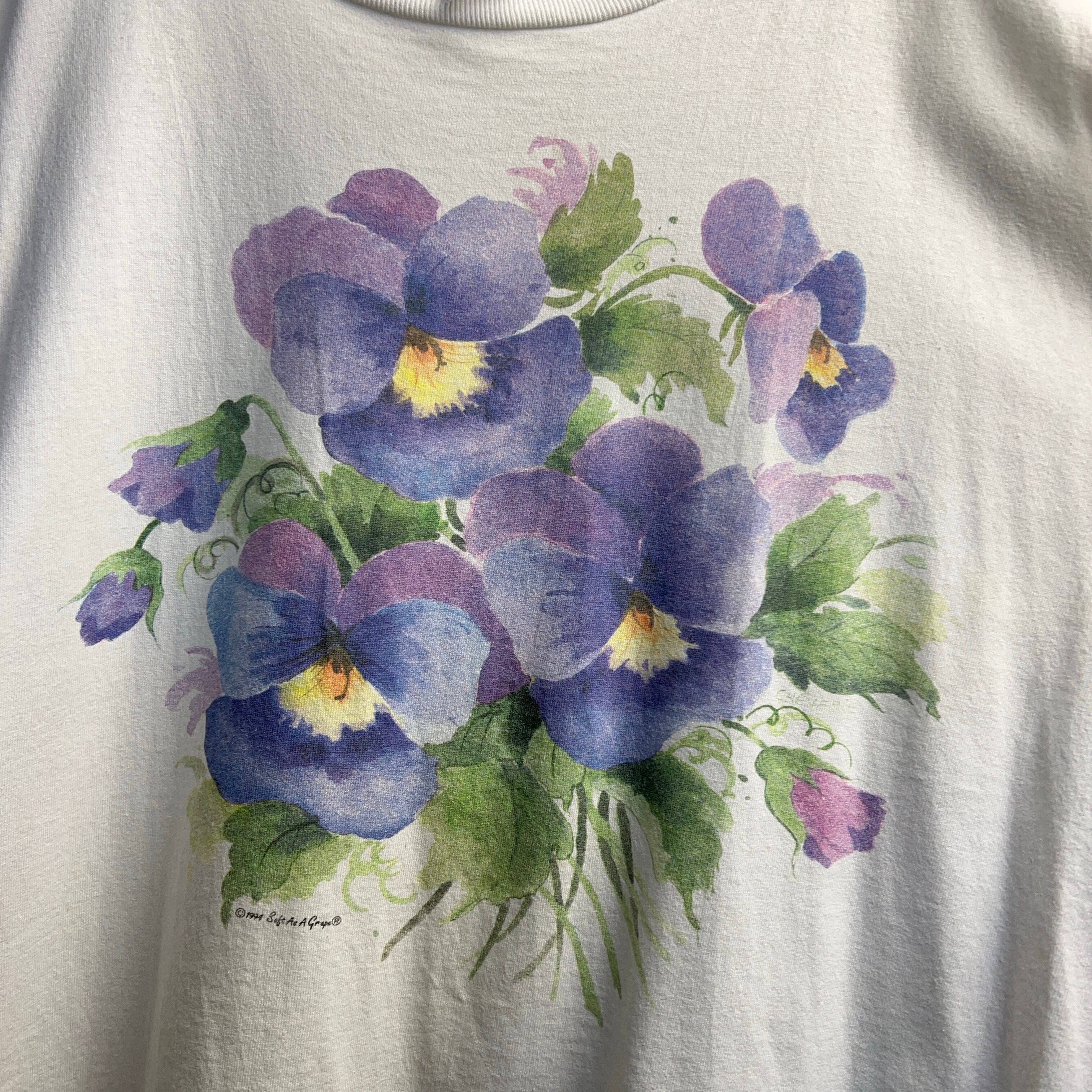 水彩画のパンジーが描かれたヴィンテージフラワーアートTシャツ。