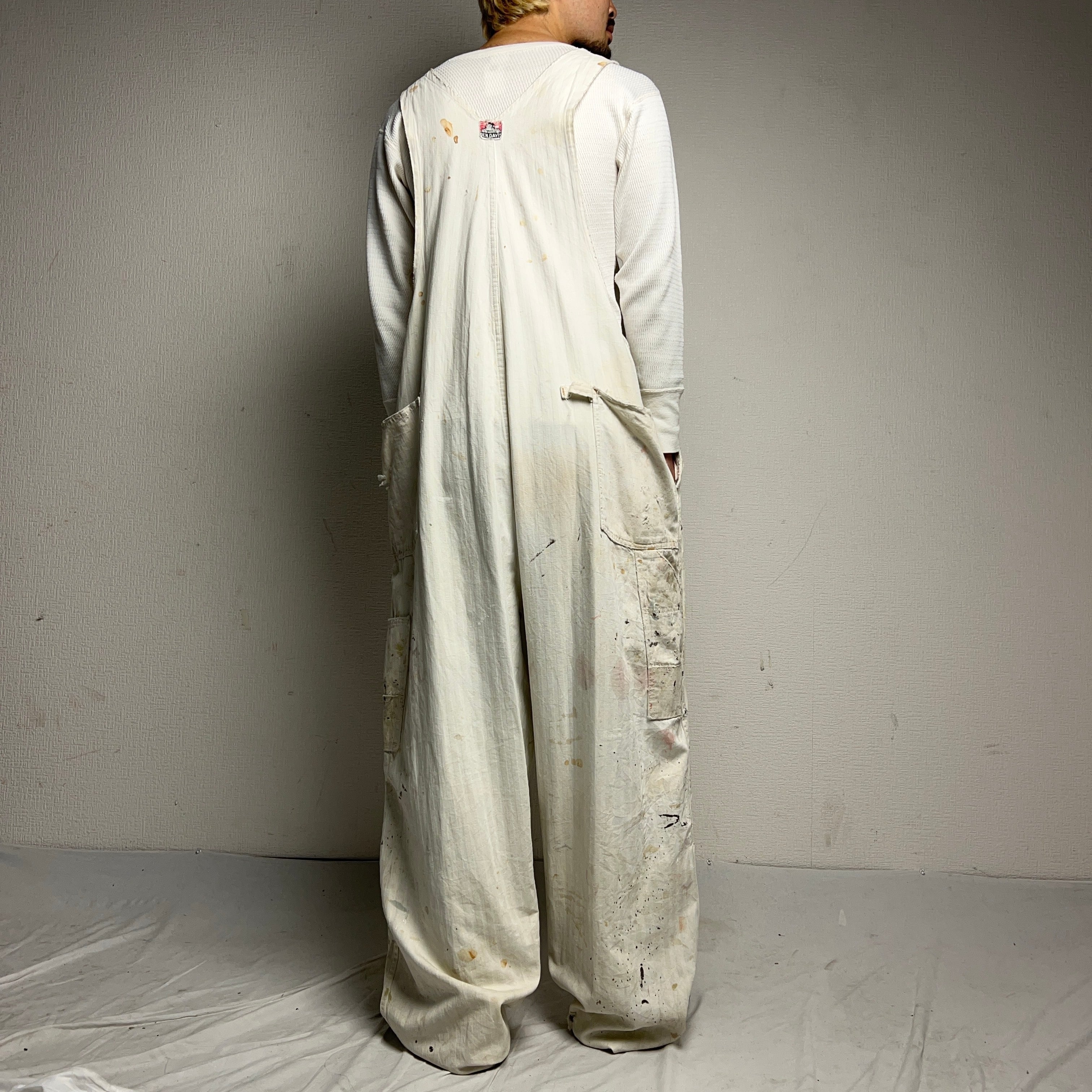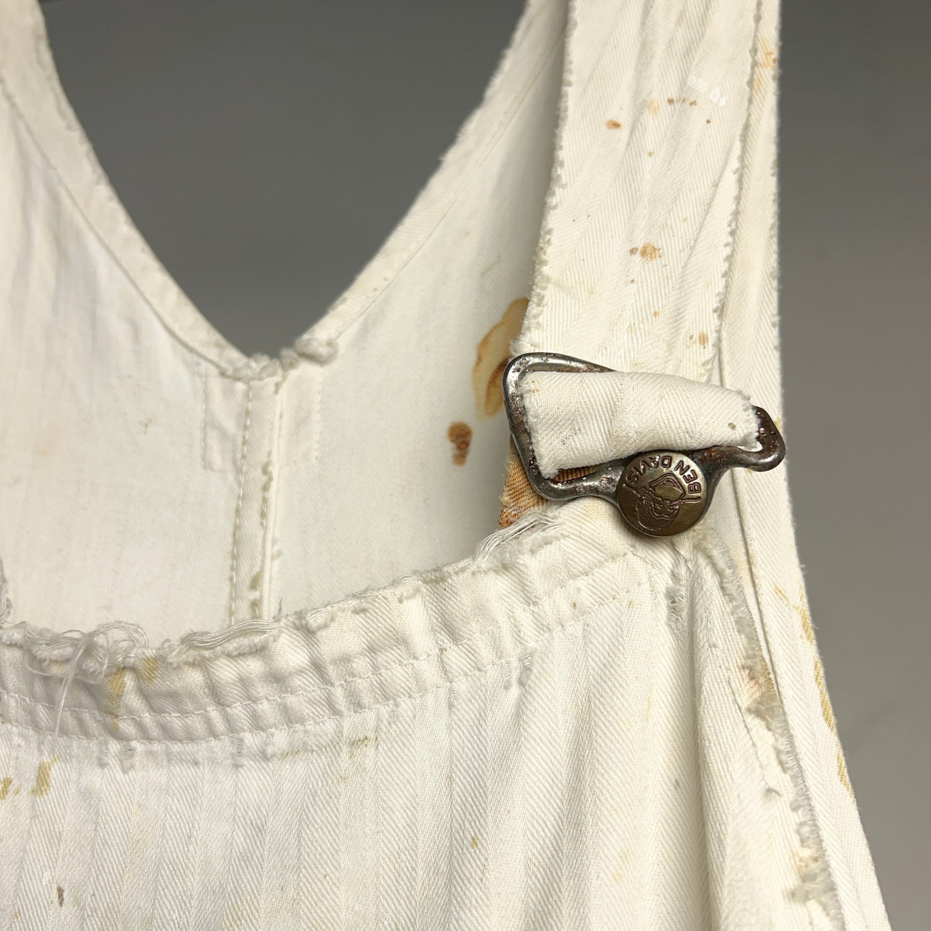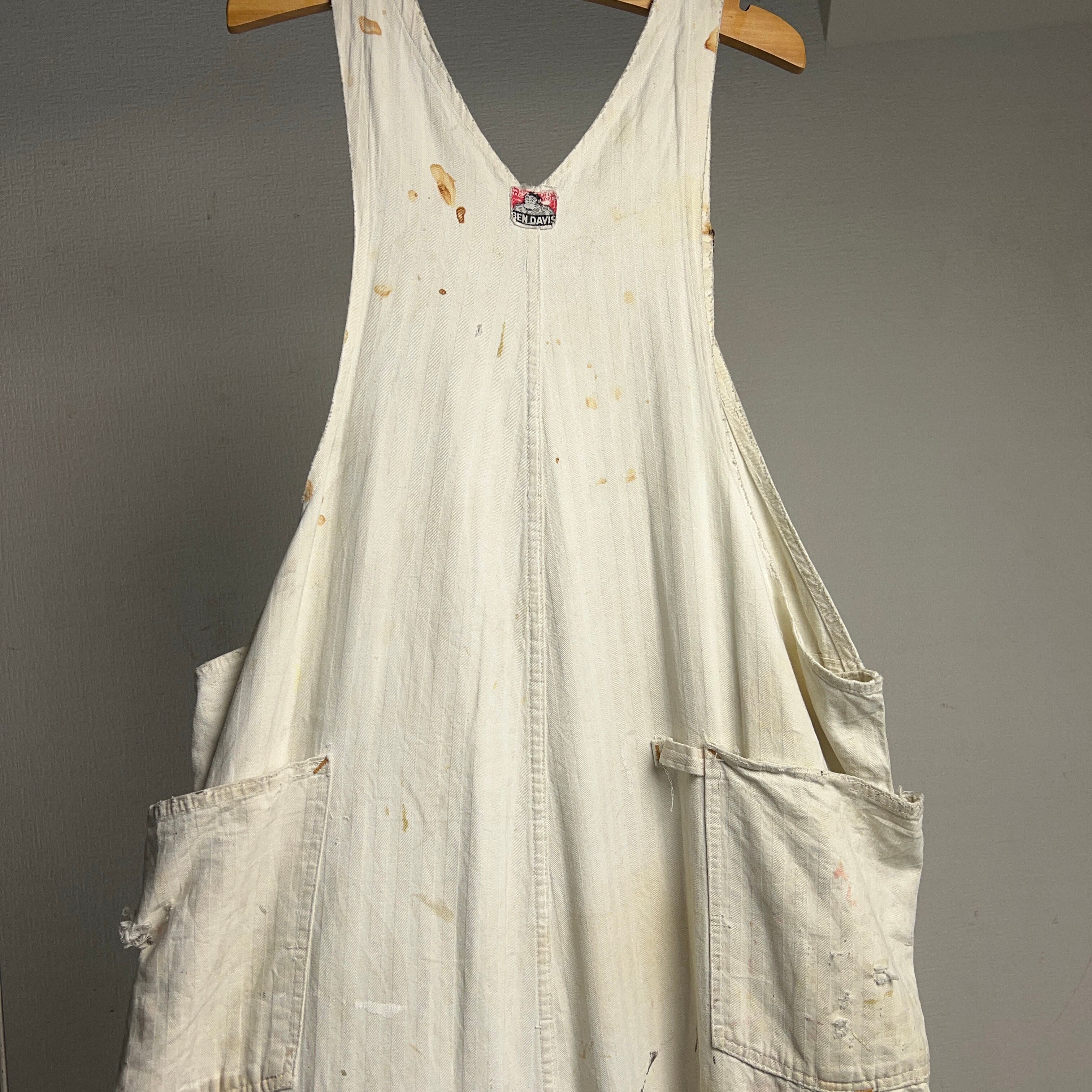 1950年代BEN DAVISのヘリンボーンツイルホワイトオーバーオール。ボロボロになるまで使い込まれた究極のヴィンテージ品。