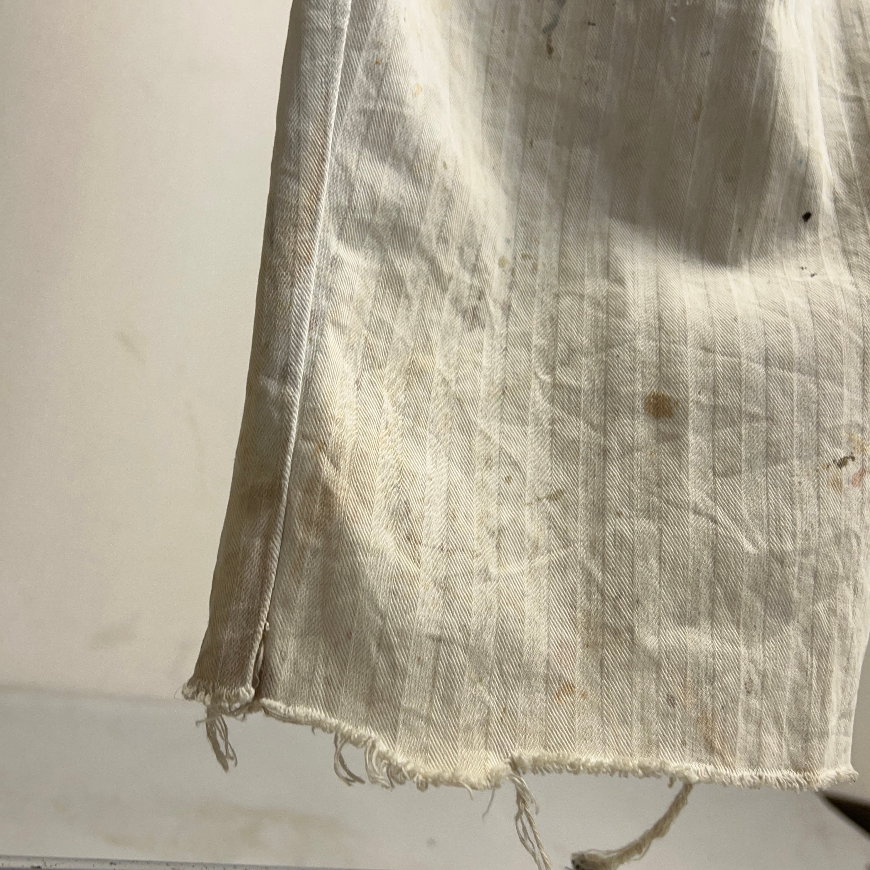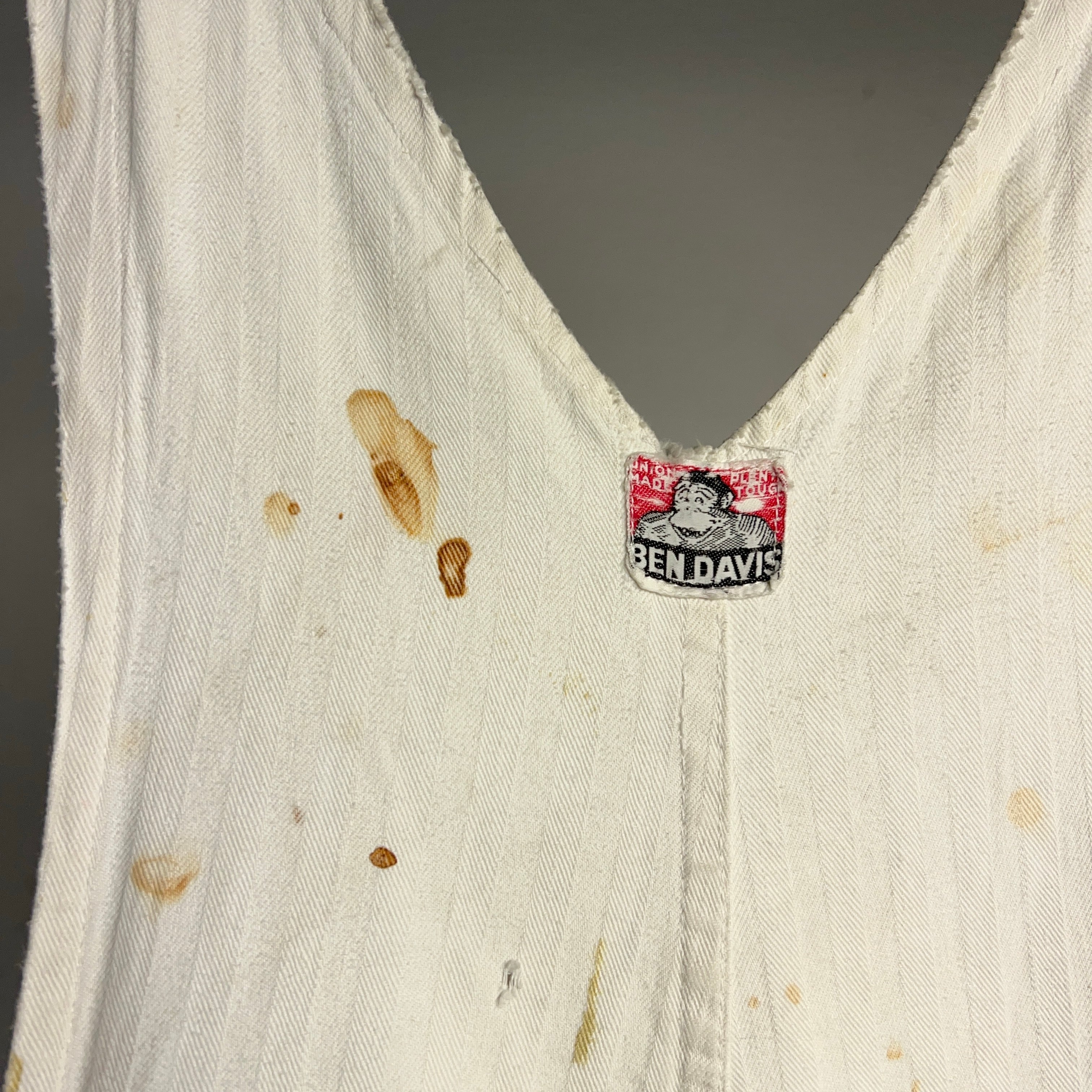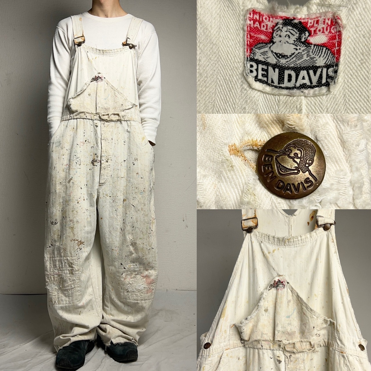 1950年代BEN DAVISのヘリンボーンツイルホワイトオーバーオール。ボロボロになるまで使い込まれた究極のヴィンテージ品。