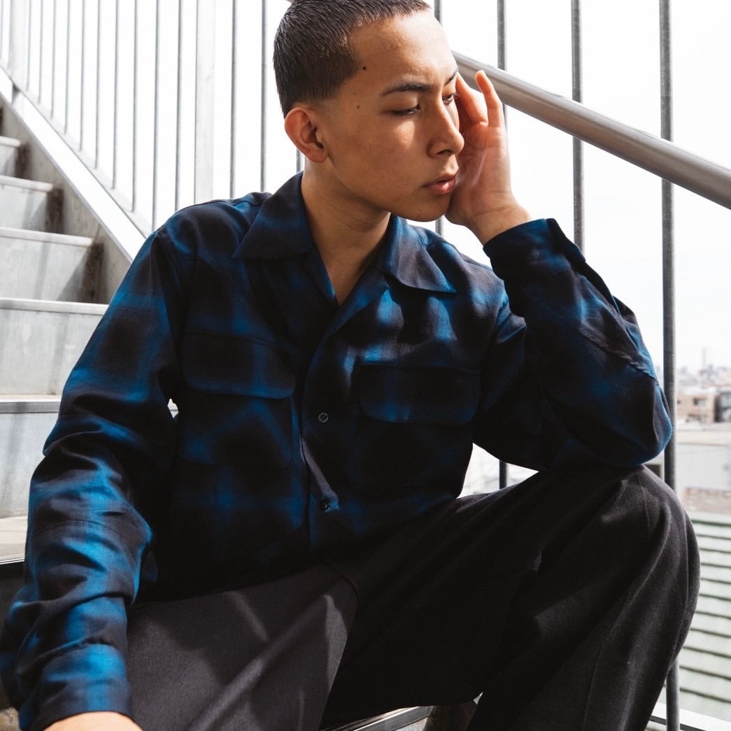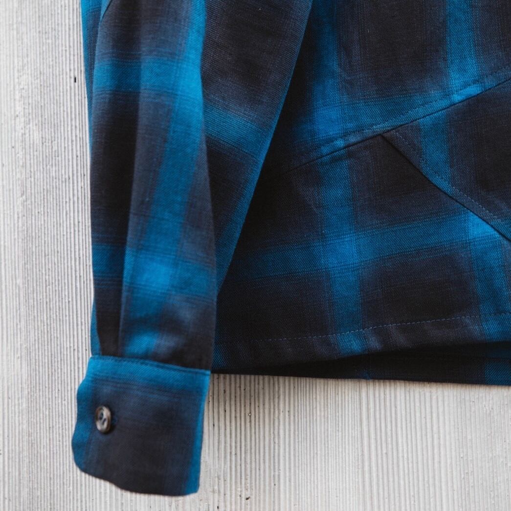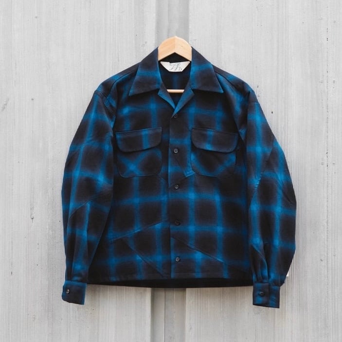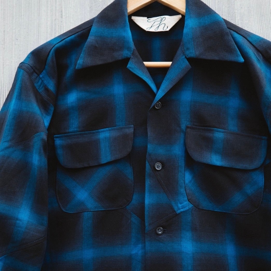 デッドストックのオンブレチェック生地を使用し、一点ずつパッチワークで組み上げたオープンカラーシャツです。