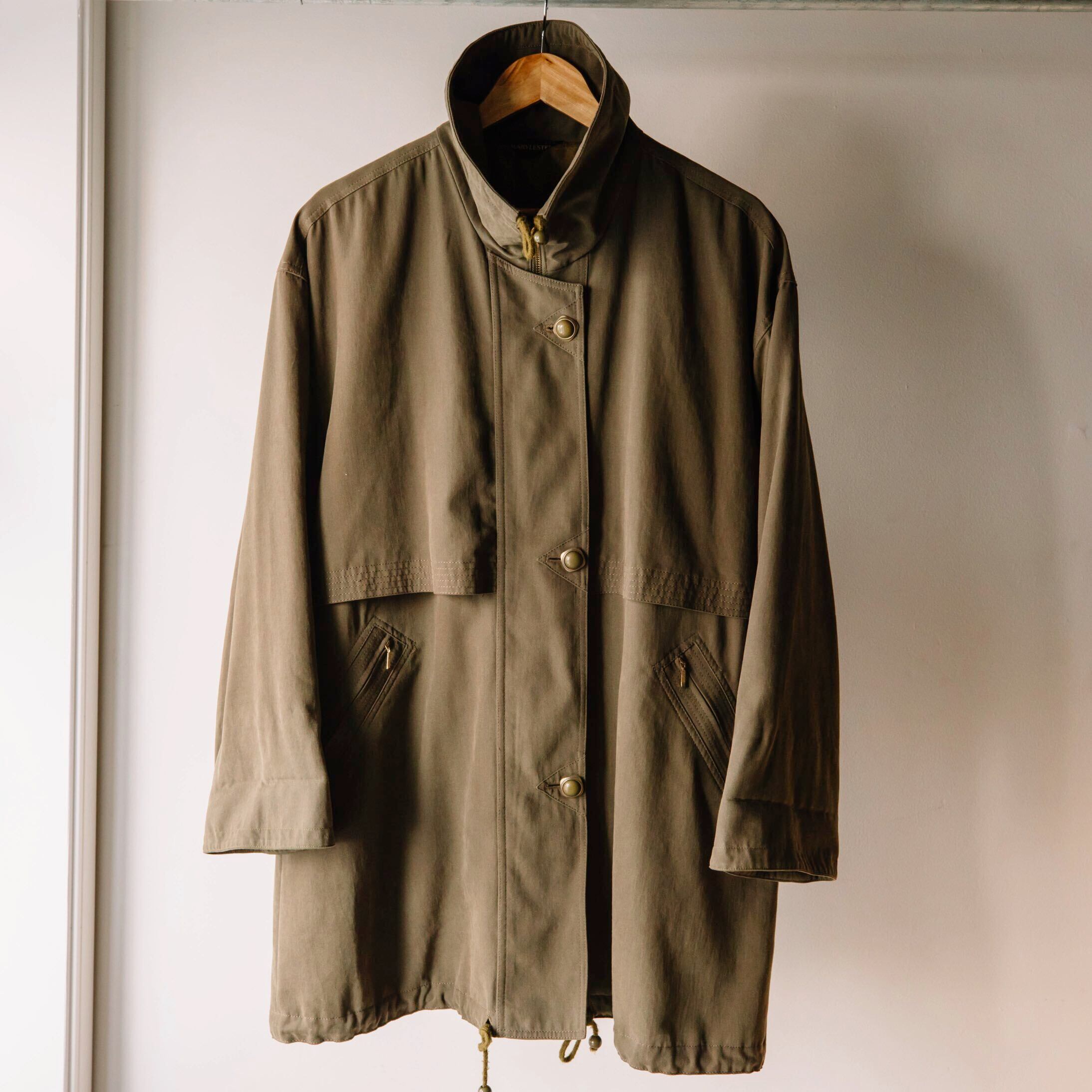 トレンチコートとモッズコートを合わせたようなデザインのハーフコート。