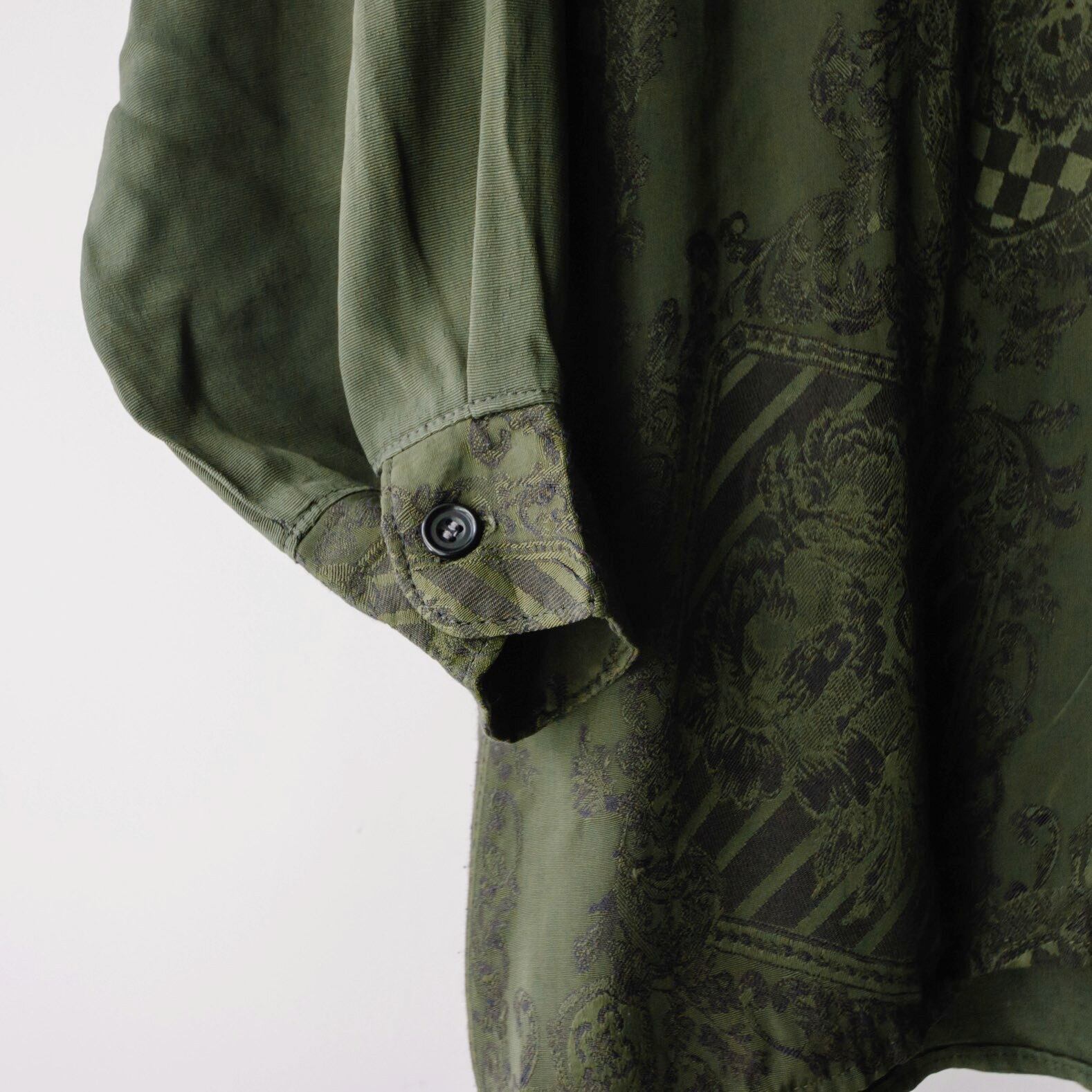 アシンメトリーにデザインされた織り柄。シブいオリーブグリーンの色合い。