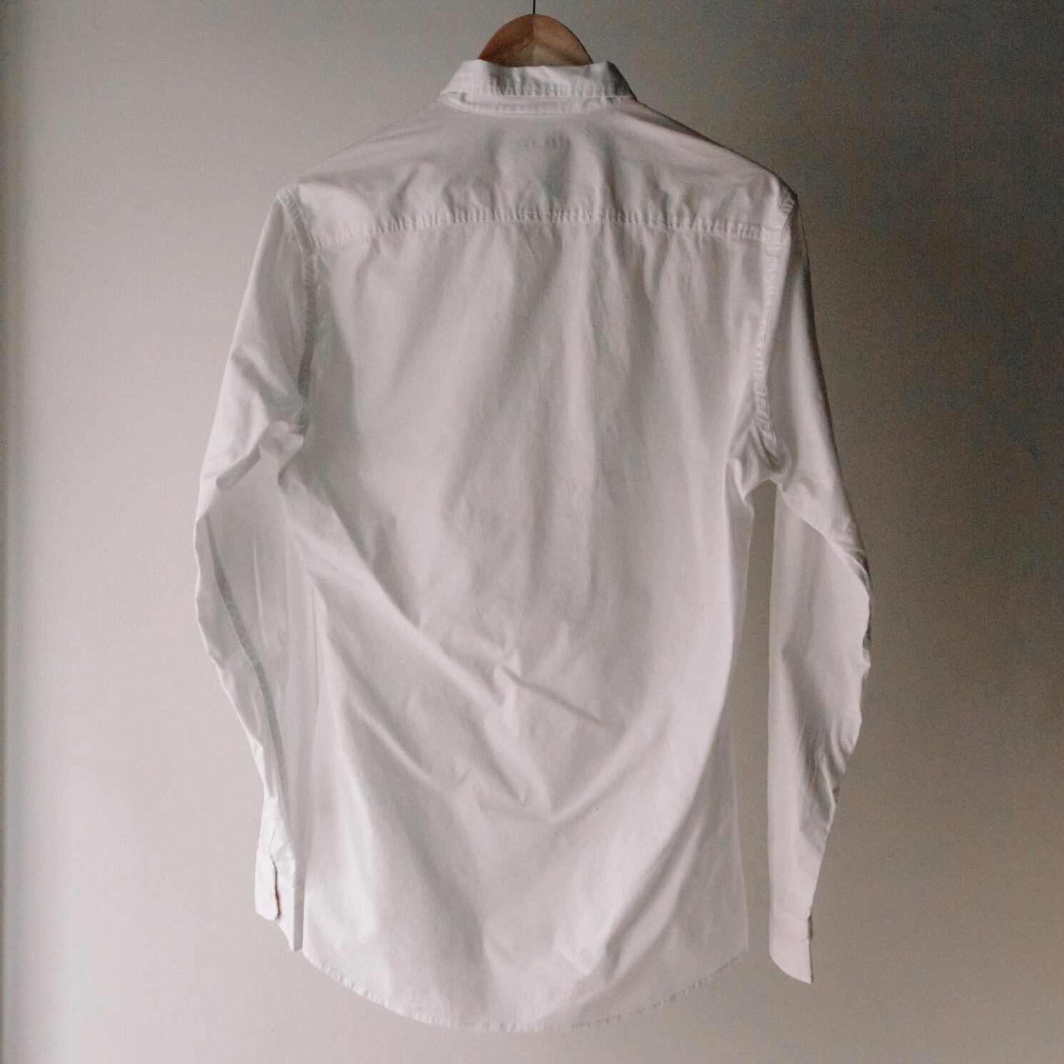 BURBERRYのシンプルなコットン白シャツ。胸にはBURBERRYのロゴ。袖をまくると伝統的なバーバリーチェックが登場。