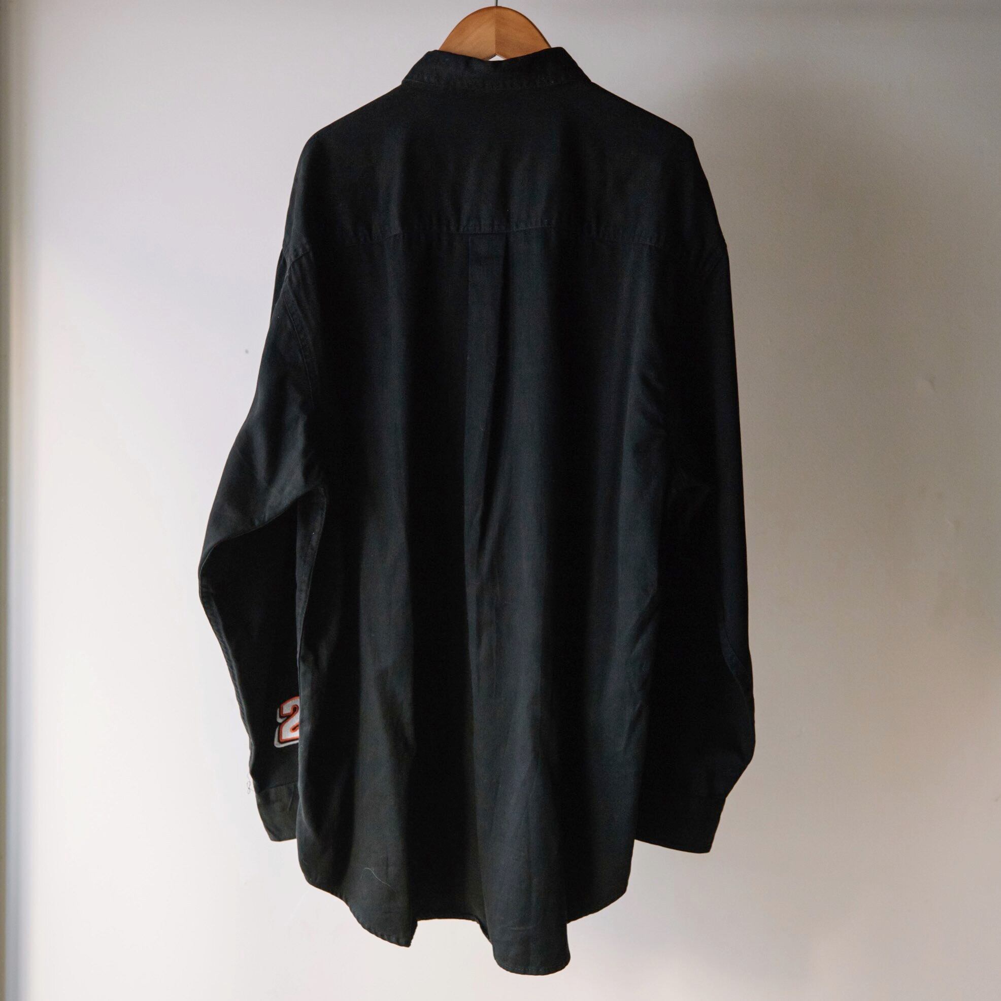 レーシング刺繍とワッペンが付いたブラックコットンシャツ。