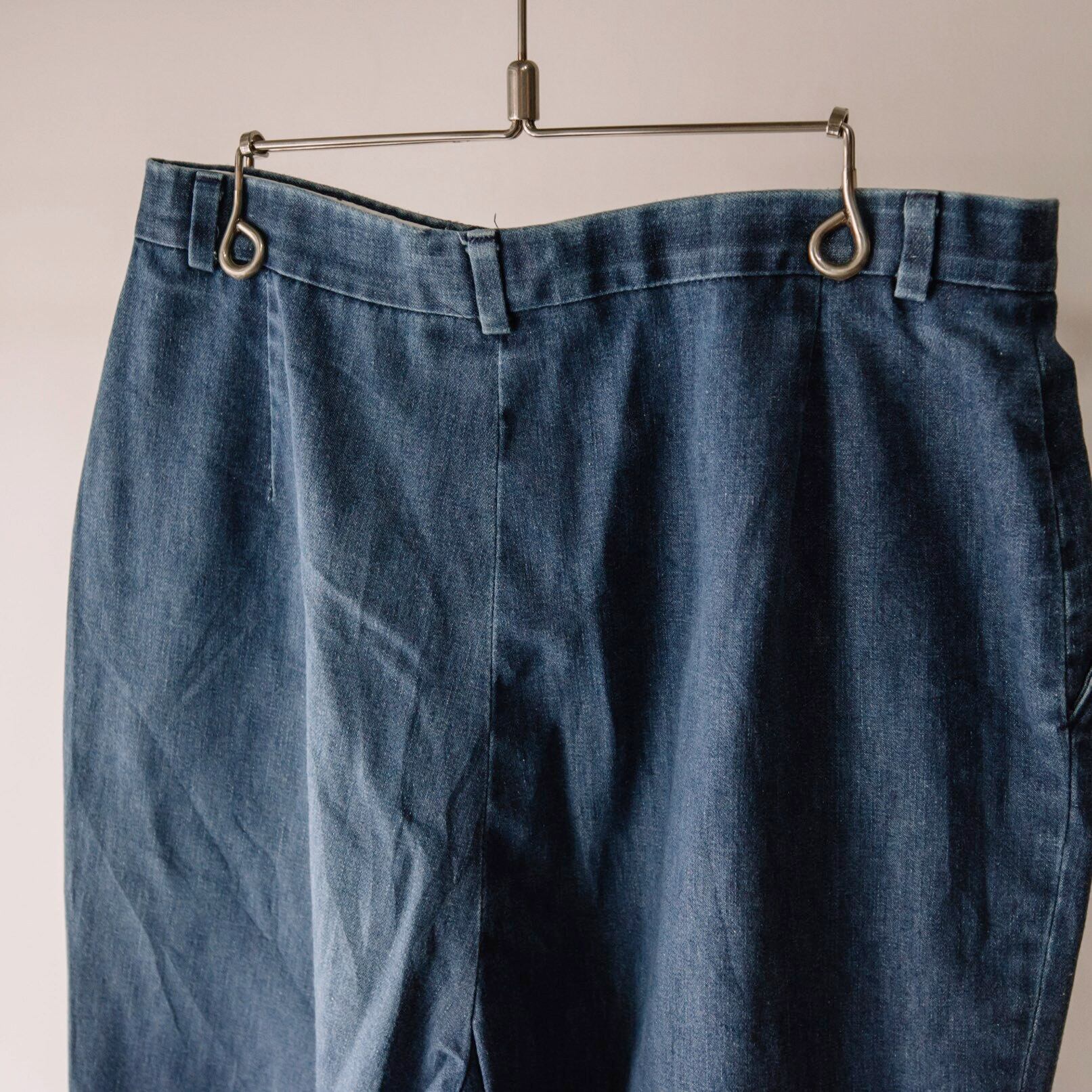 あえてデニム生地で作られたスラックス。綺麗さとワークのカジュアルさがミックスされたとてもオシャレなパンツです。