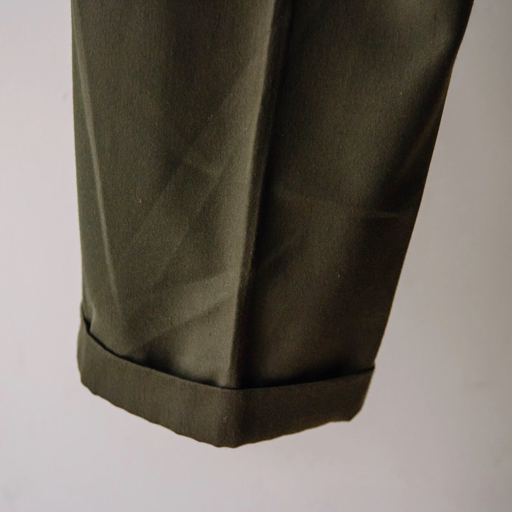 ダークグリーン色のオトナなスラックスパンツ。2タック入りでゆとりのあるシルエット。