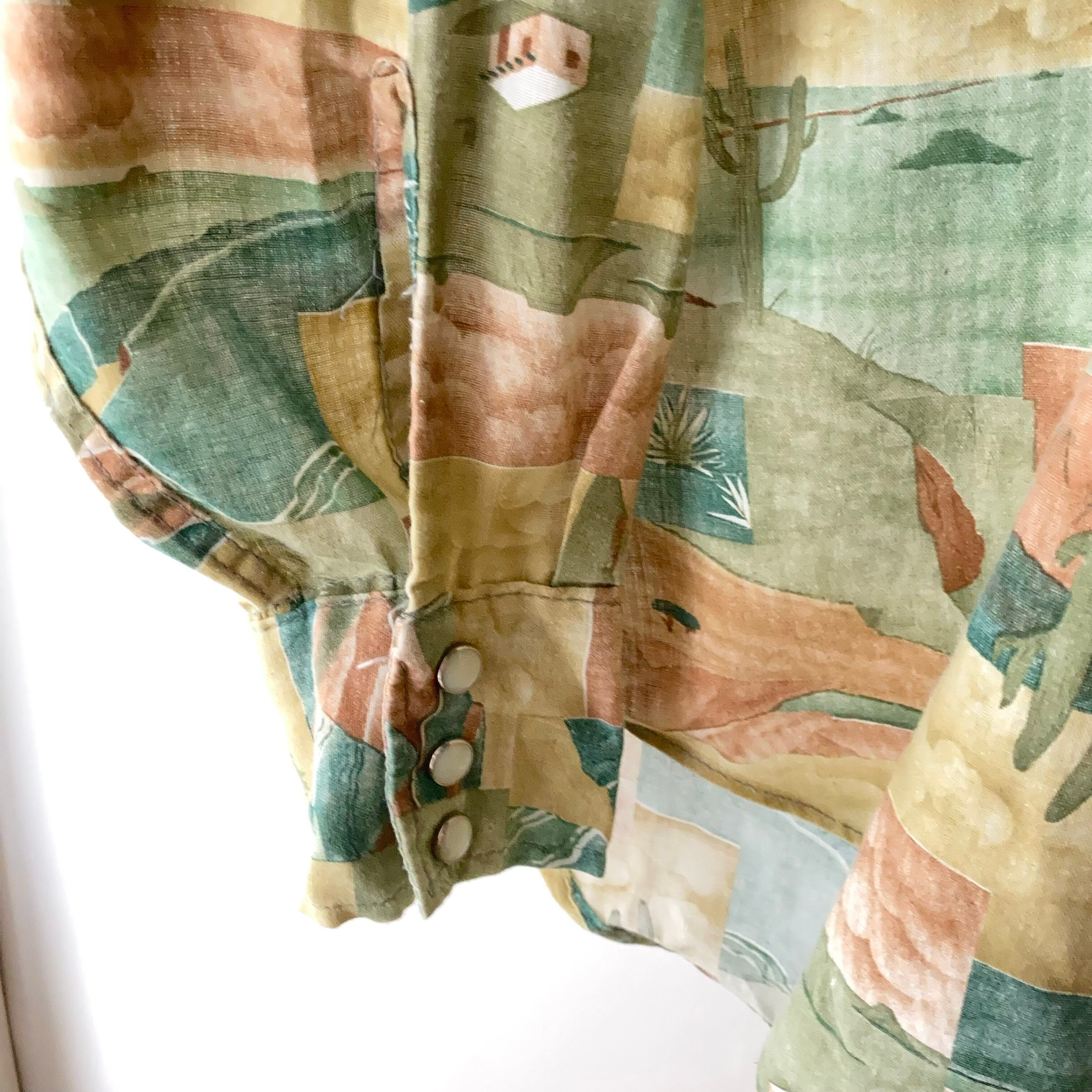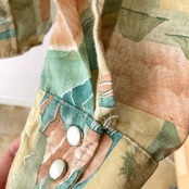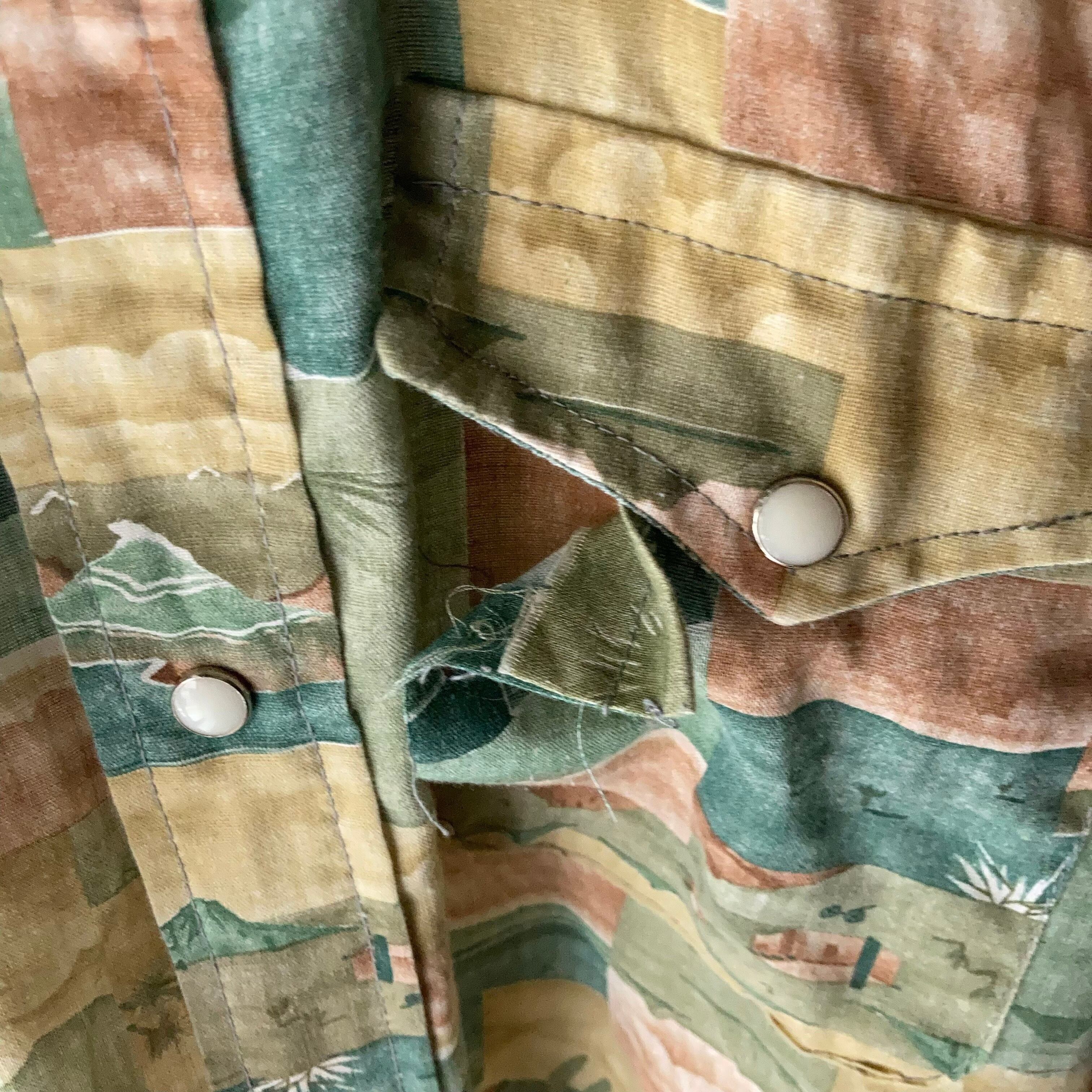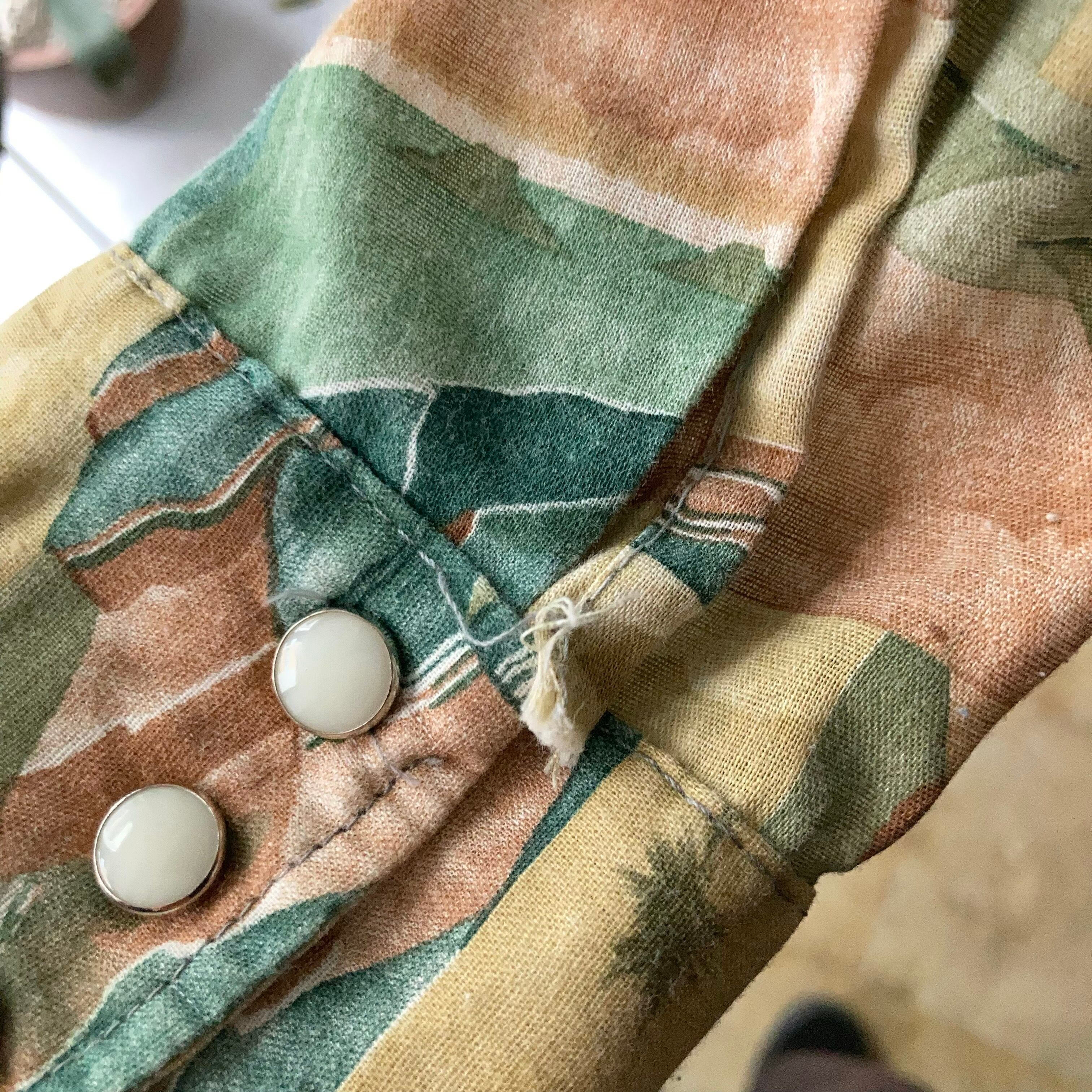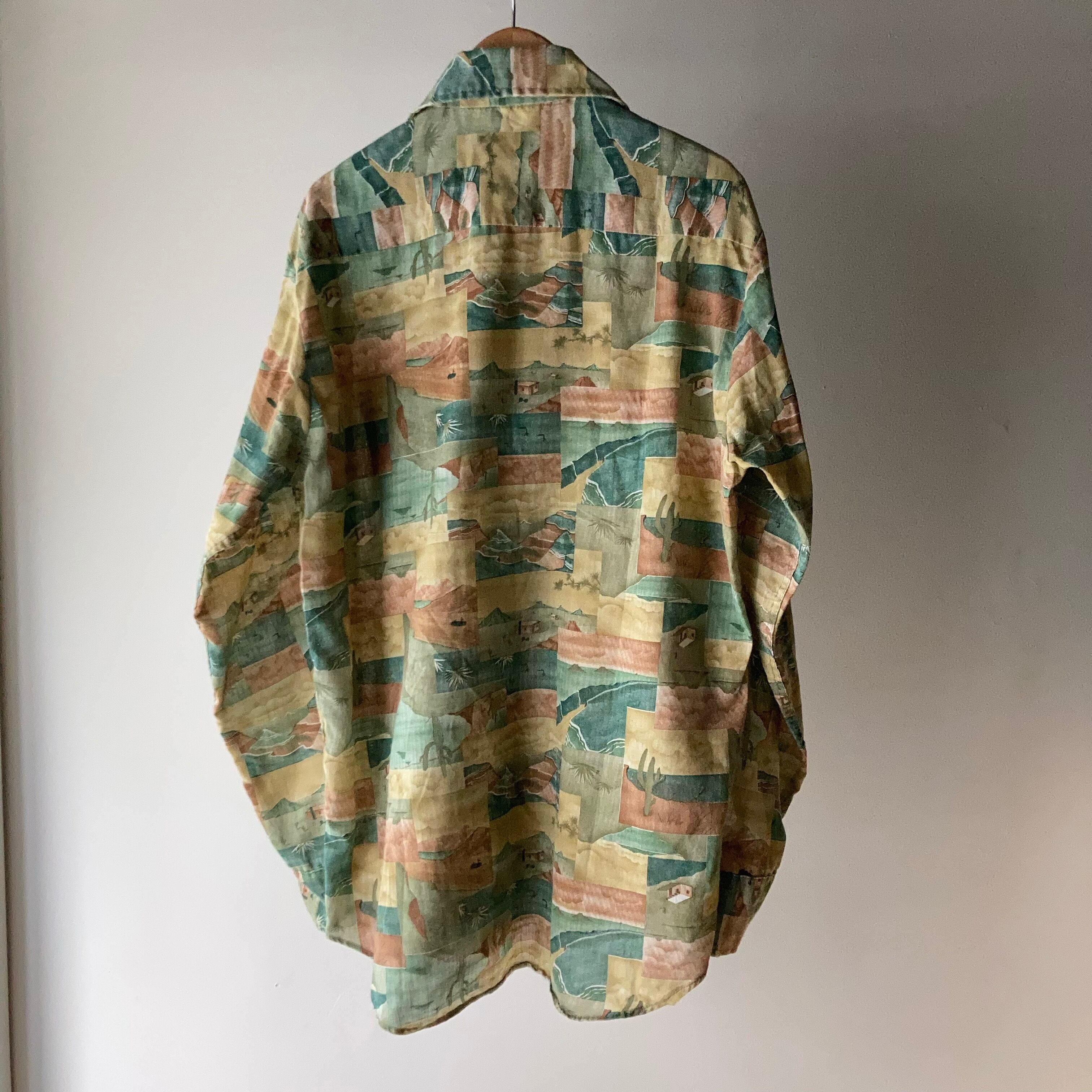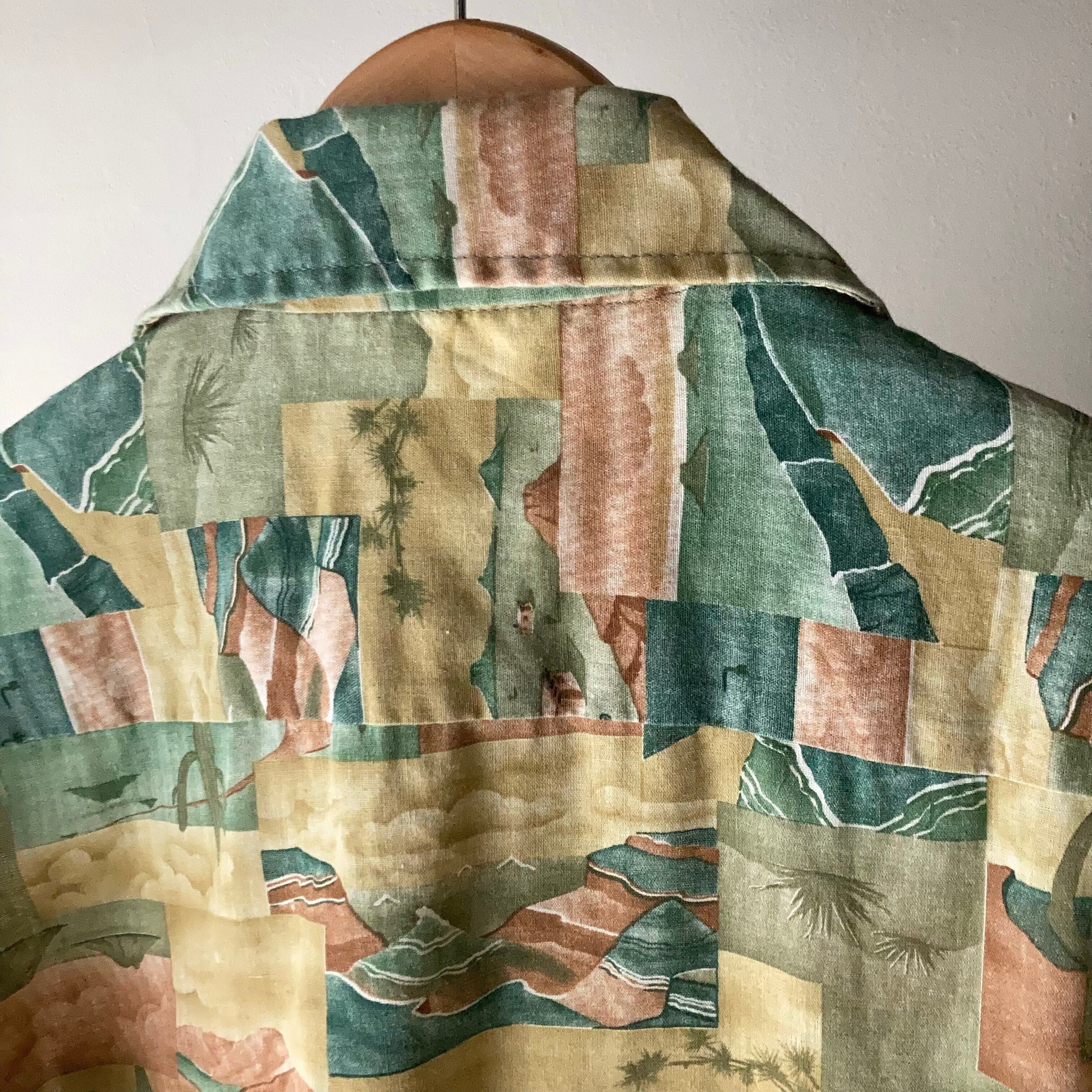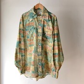 アートな70's 総柄ウエスタンシャツ。グリーンとブラウン系のアースカラーでまとまっているのでなんだか安心感があります。シンプルになりがちな秋冬のコーディネートのアクセントとしていかがでしょう!