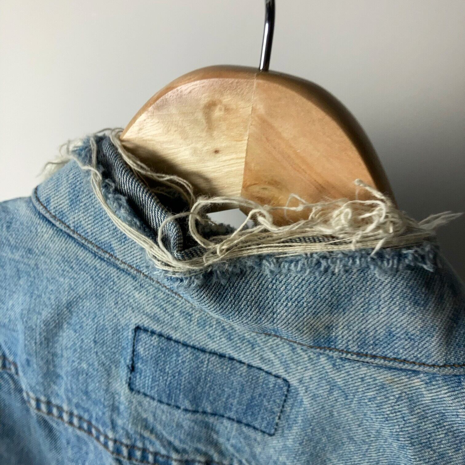 【商品の状態ランク】: E (色落ち、ダメージ複数、小シミ、汚れ、片袖ボタン外れ)