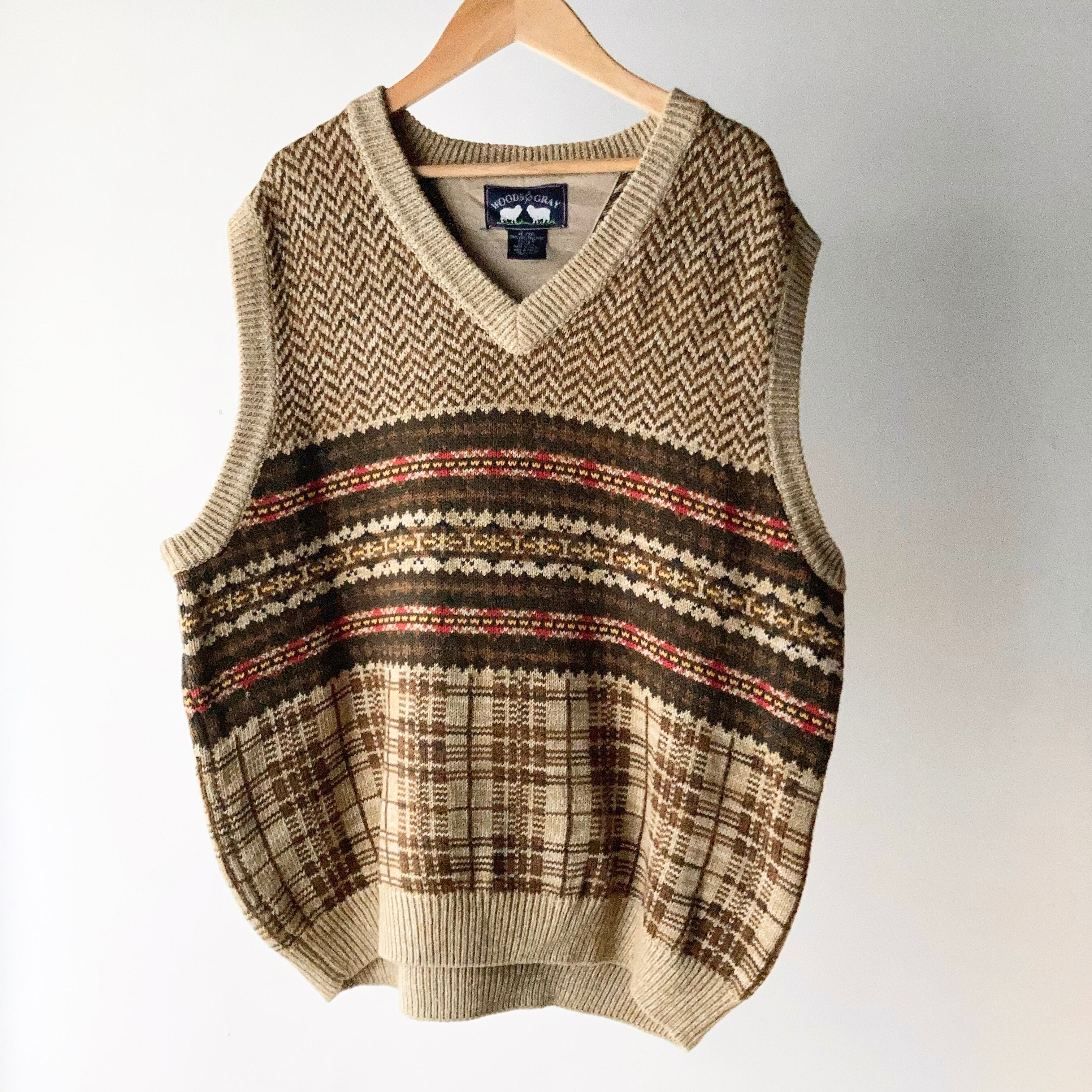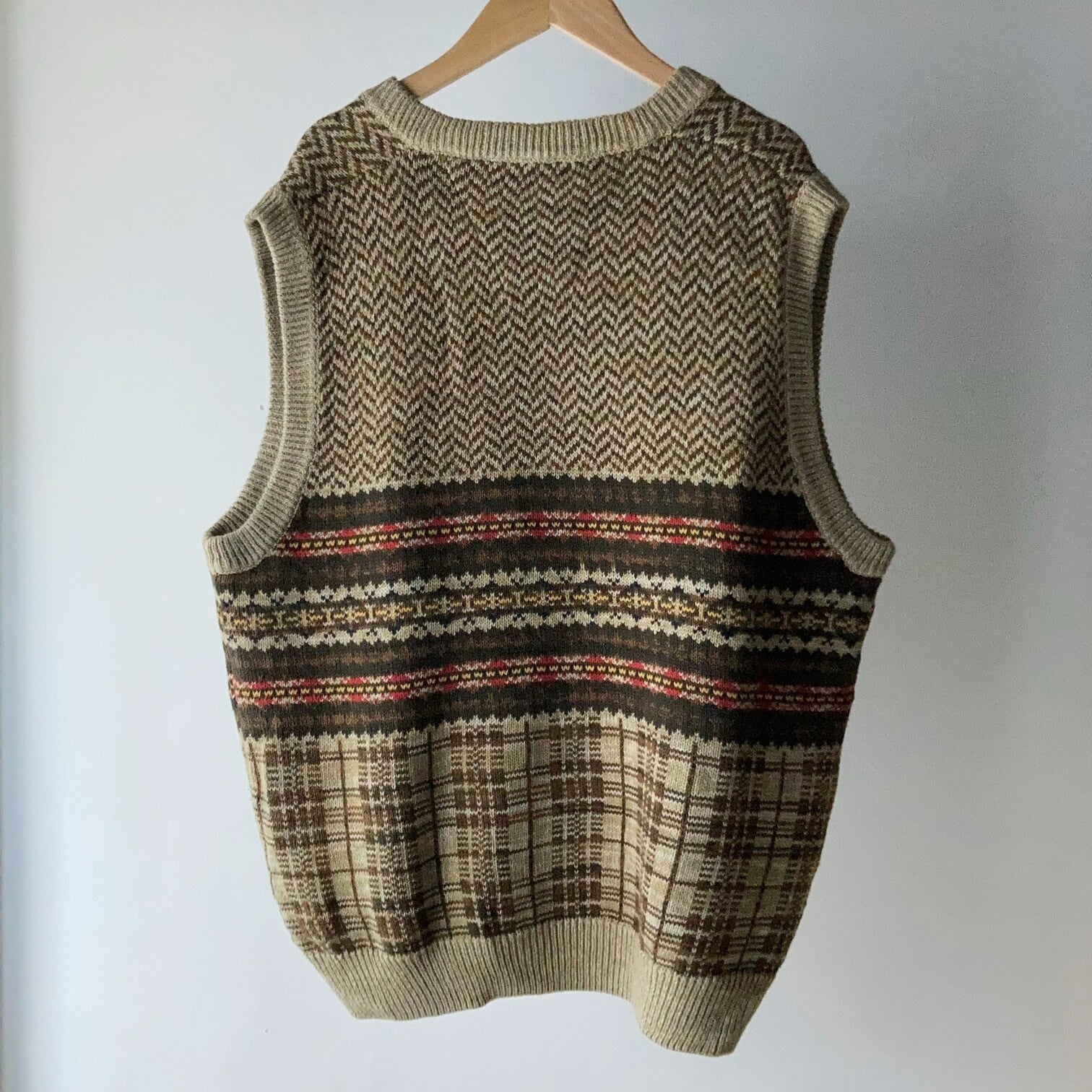 ヘリンボーン柄、ノルディック柄、チェック柄の3種類が使われた可愛いニットベスト。