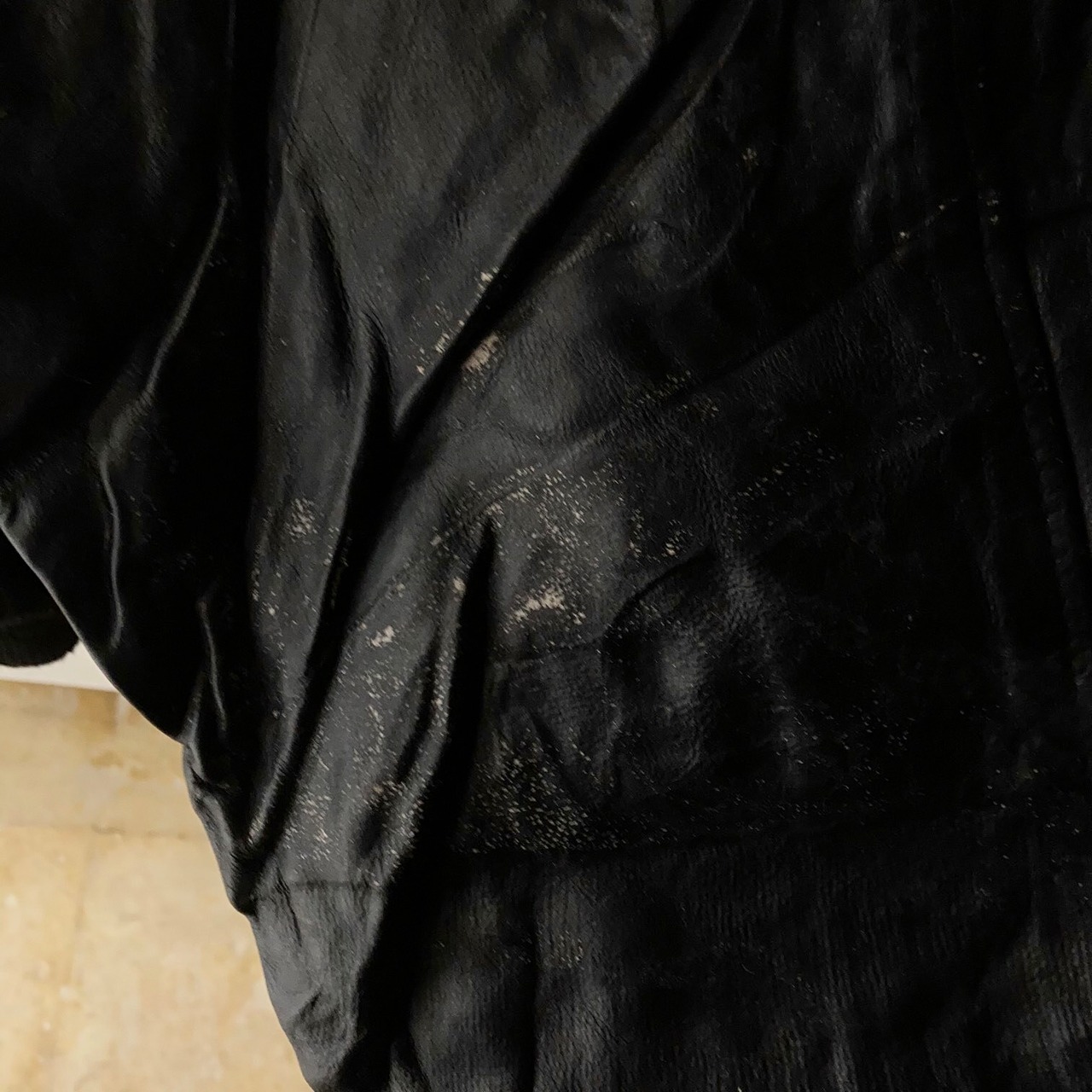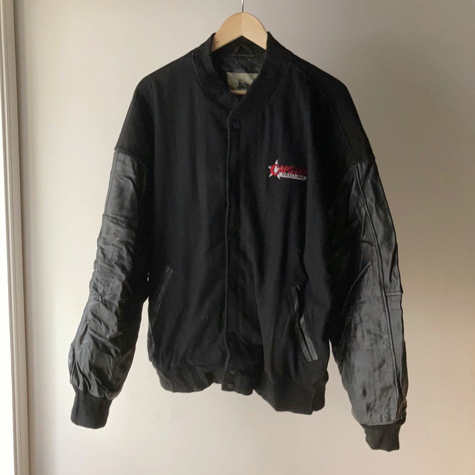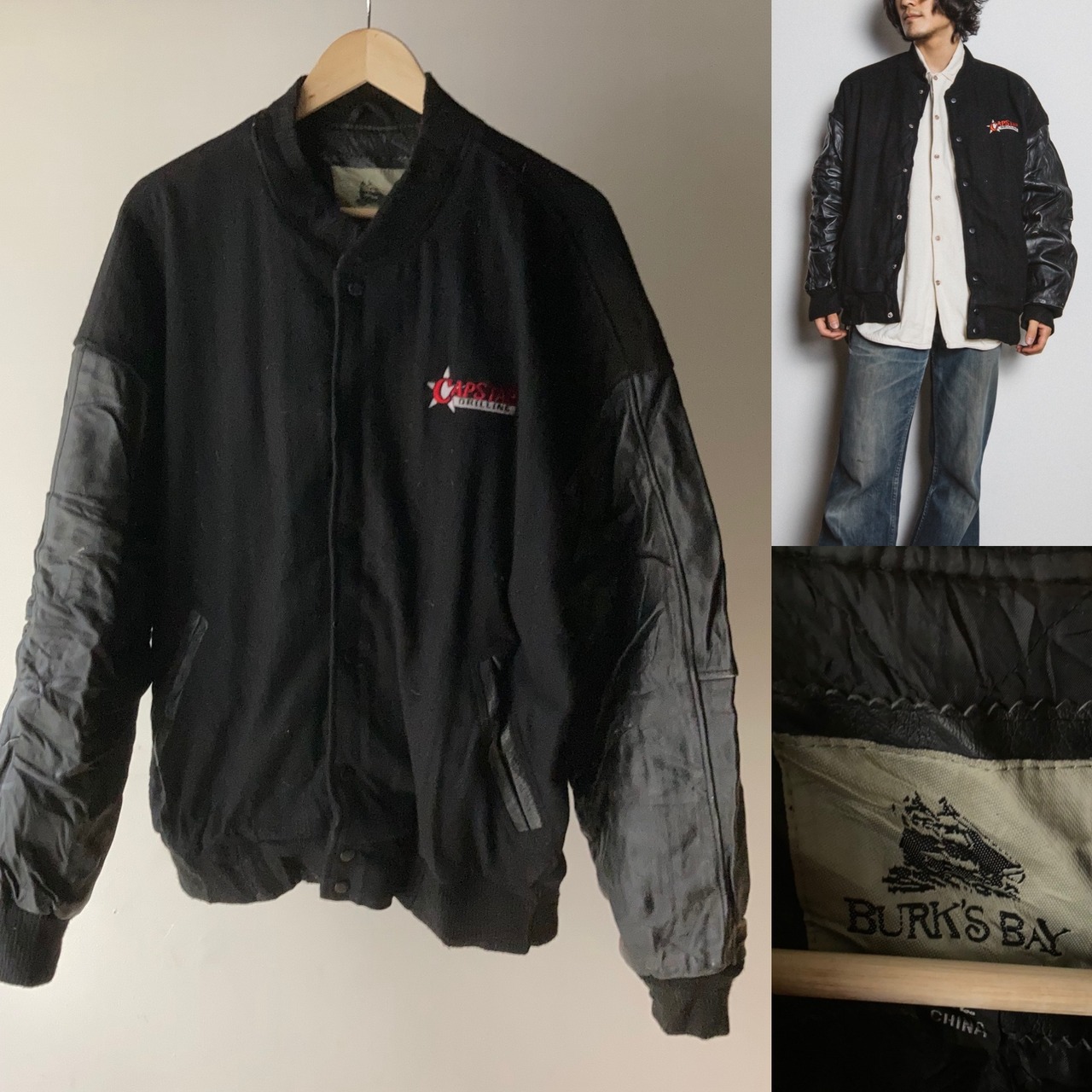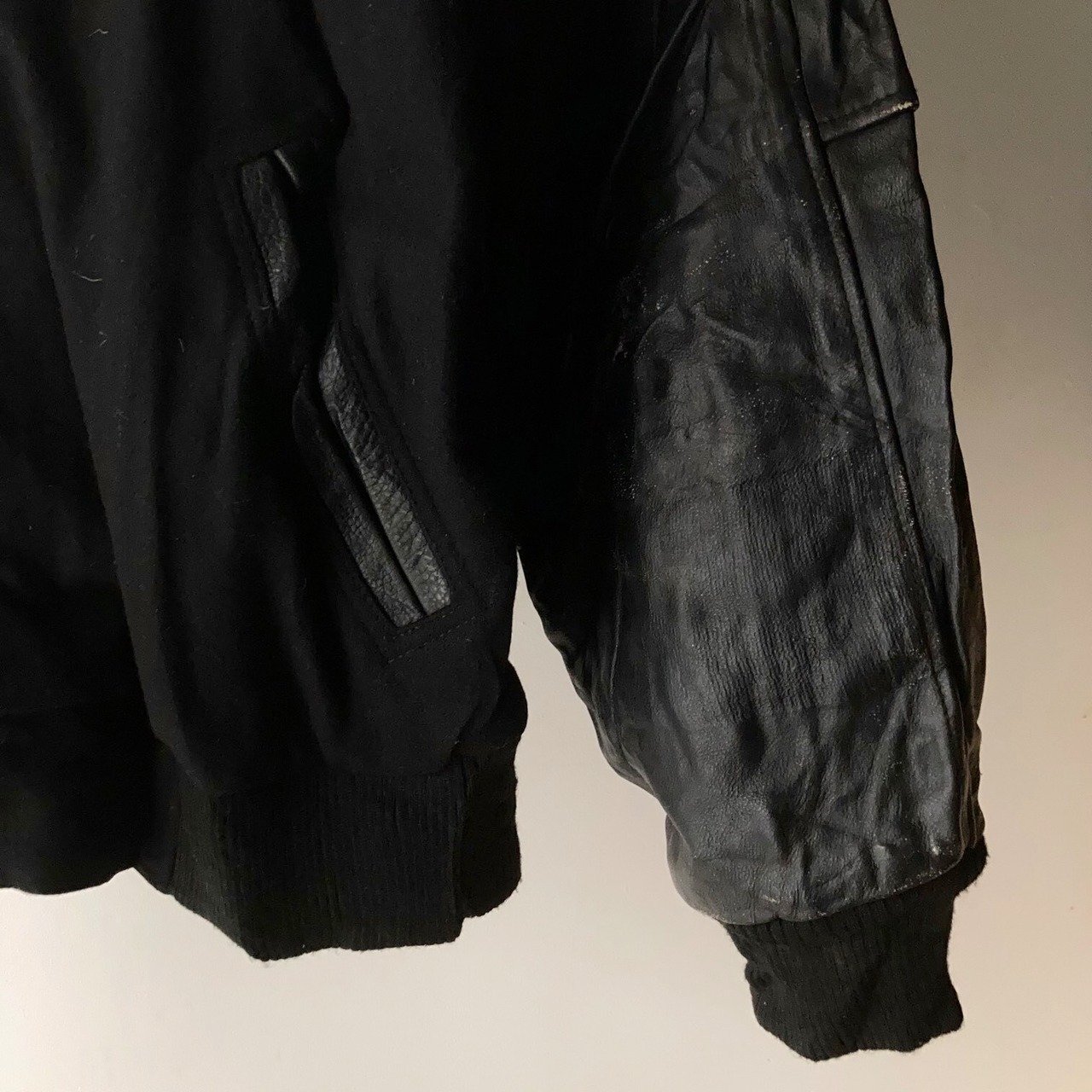 袖がレザー切り替えのオールブラックスタジャン。
