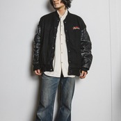 刺繍入り レザー切り替え ブラックスタジャン【1113T16】