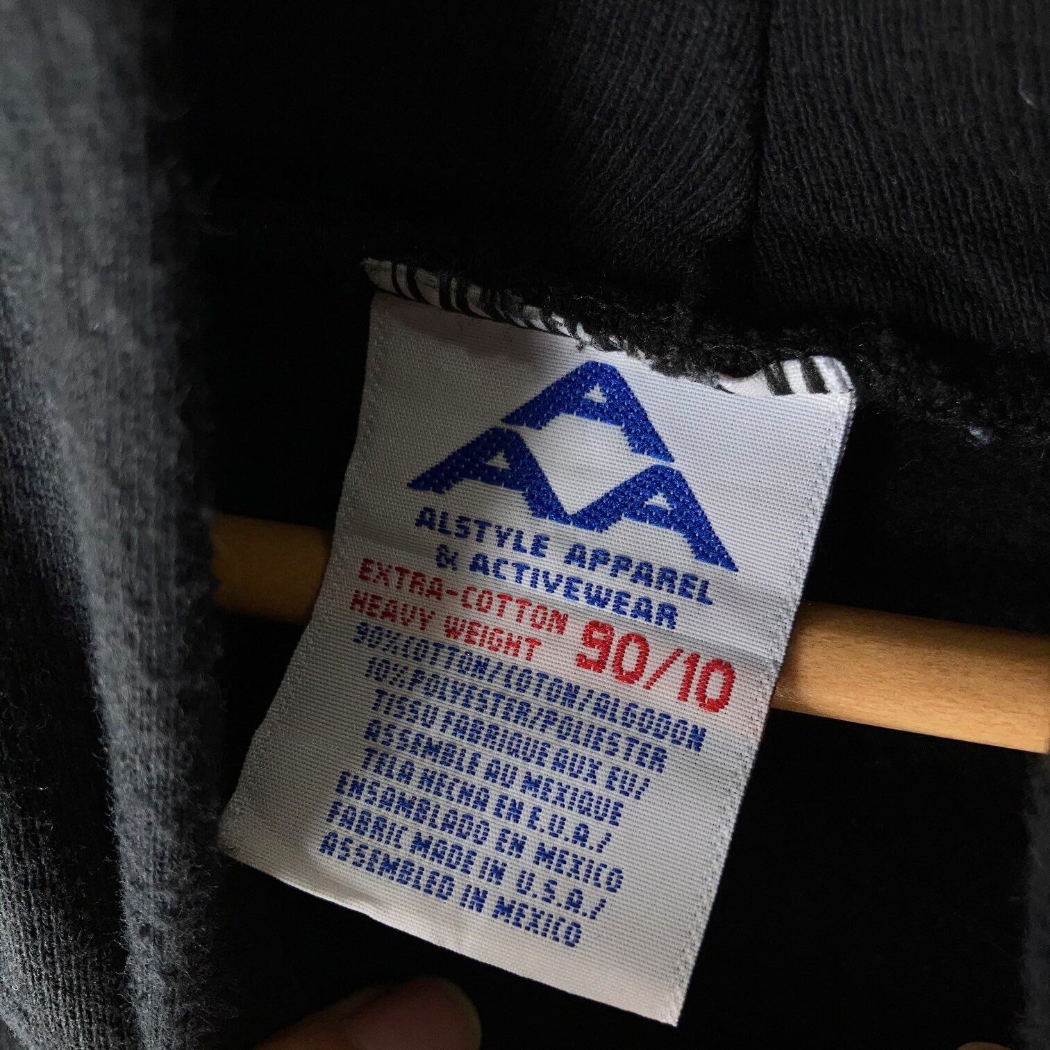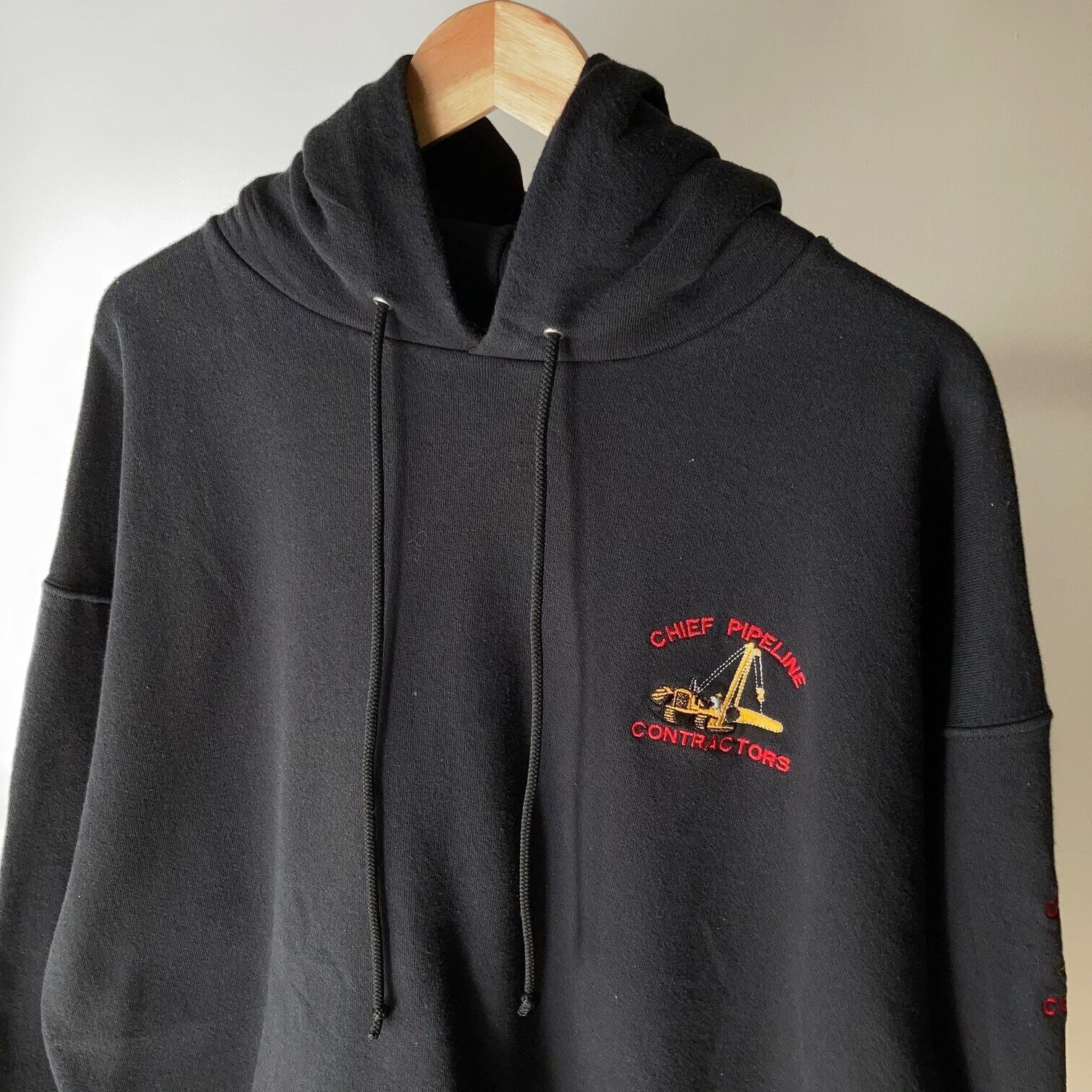 袖と胸に刺繍が入ったシンプルなブラックスウェットパーカー。