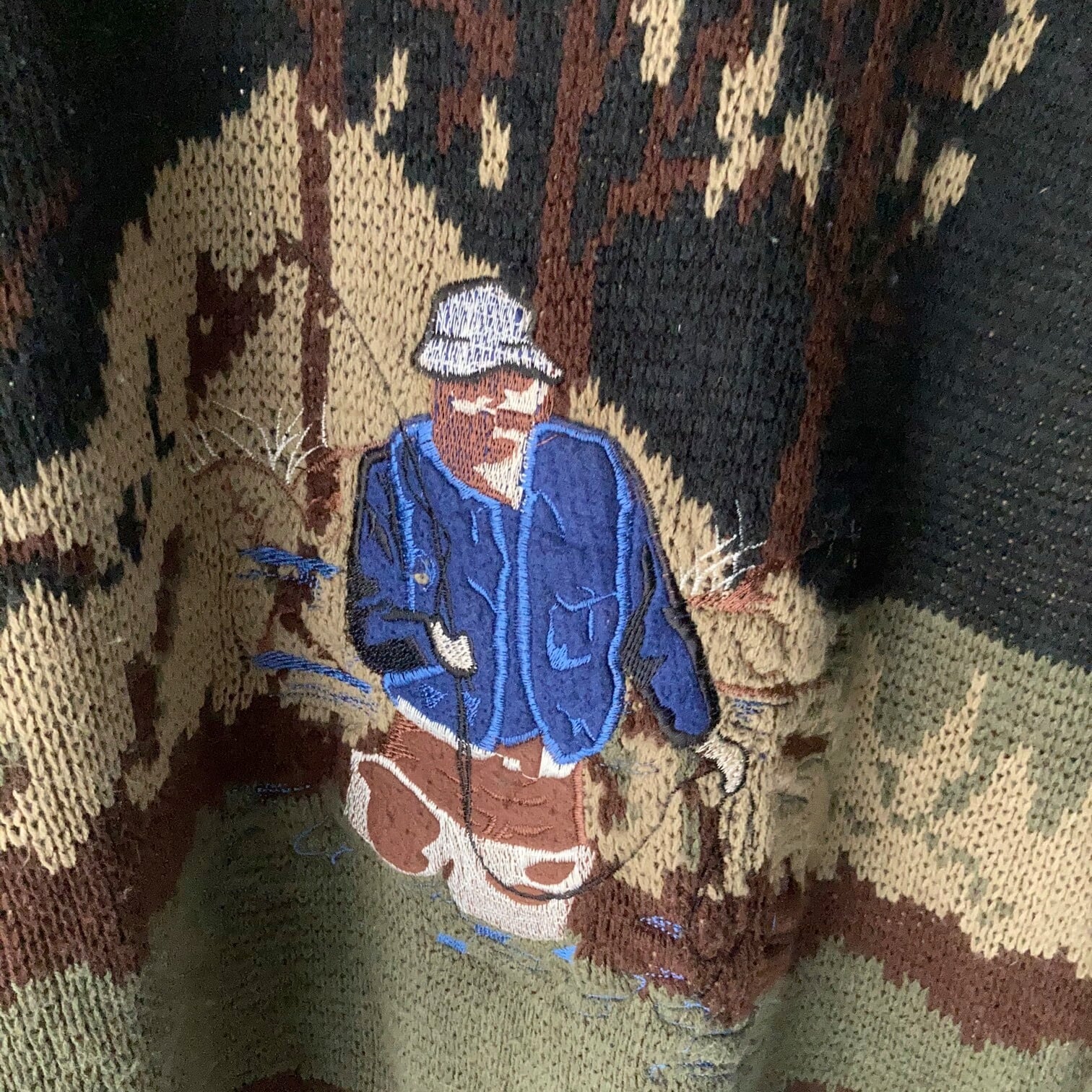 フライフィッシングアングラーが刺繍された可愛いニットセーター。