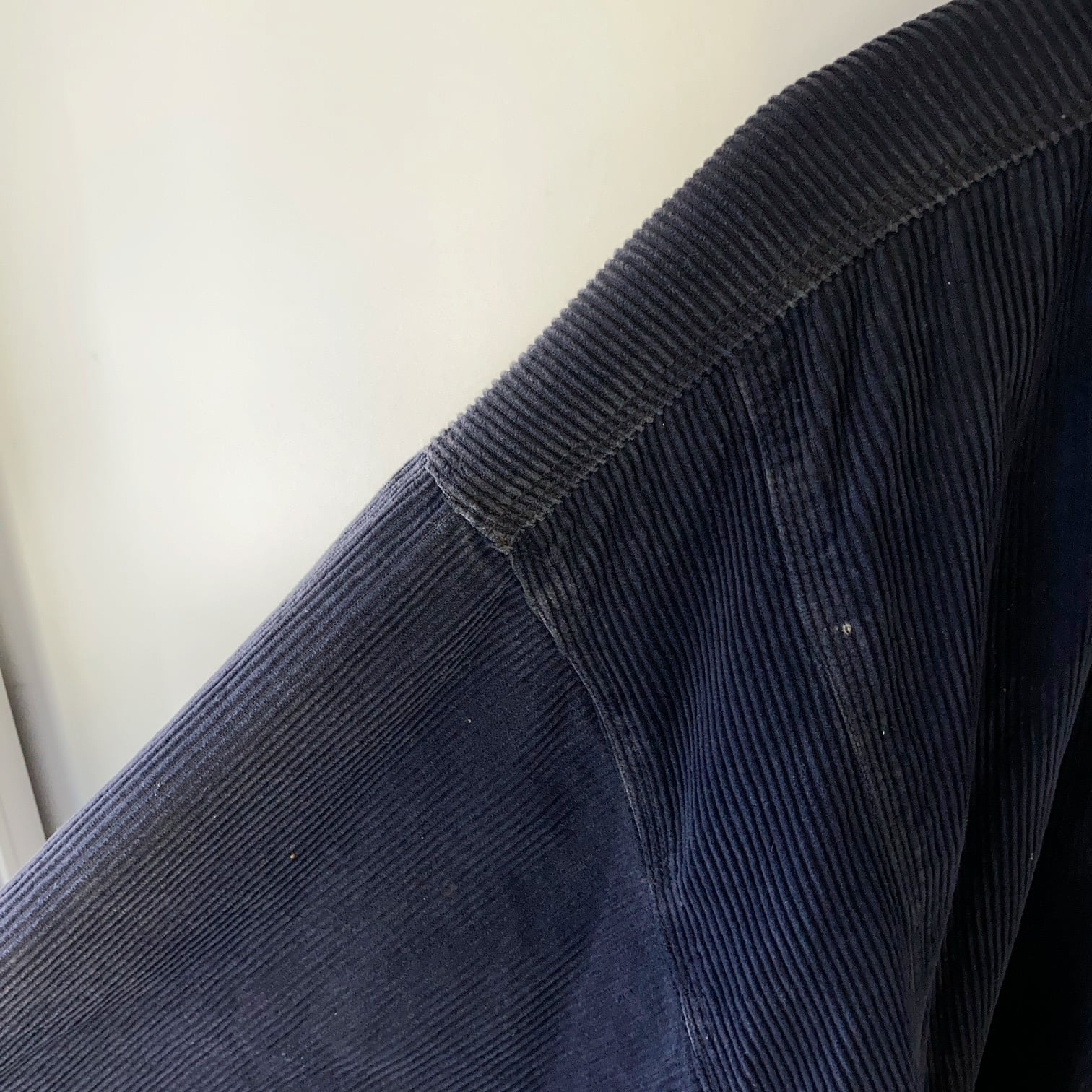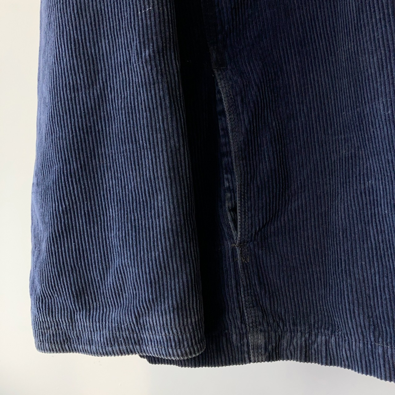 ネイビーのシンプルなコーデュロイジャケット。裏地はキルティングとなっています。