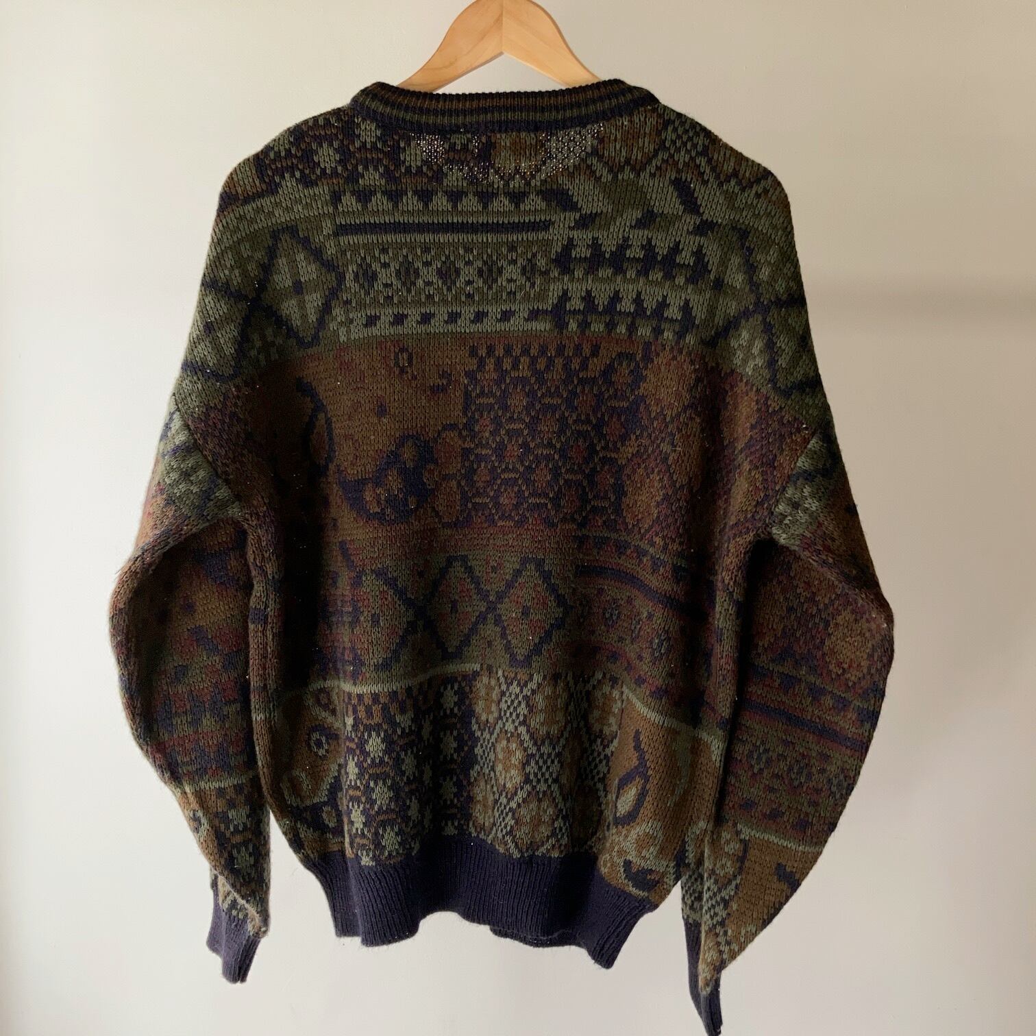 パッチワーク風の総柄デザインニットです。