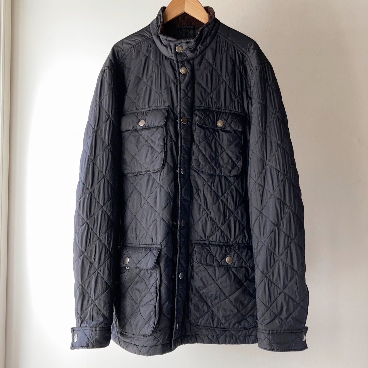襟と袖裏にコーデュロイ生地を使用した英国風なキルティングジャケット。
