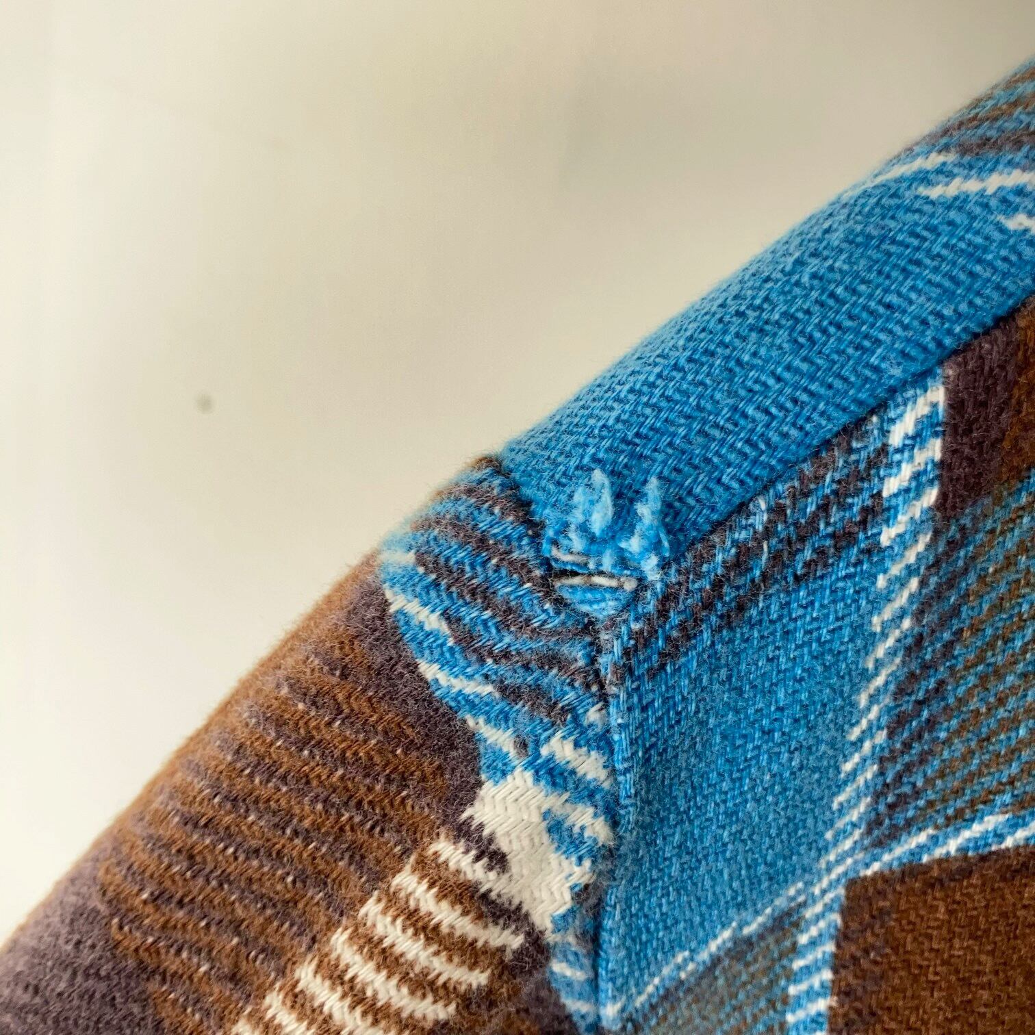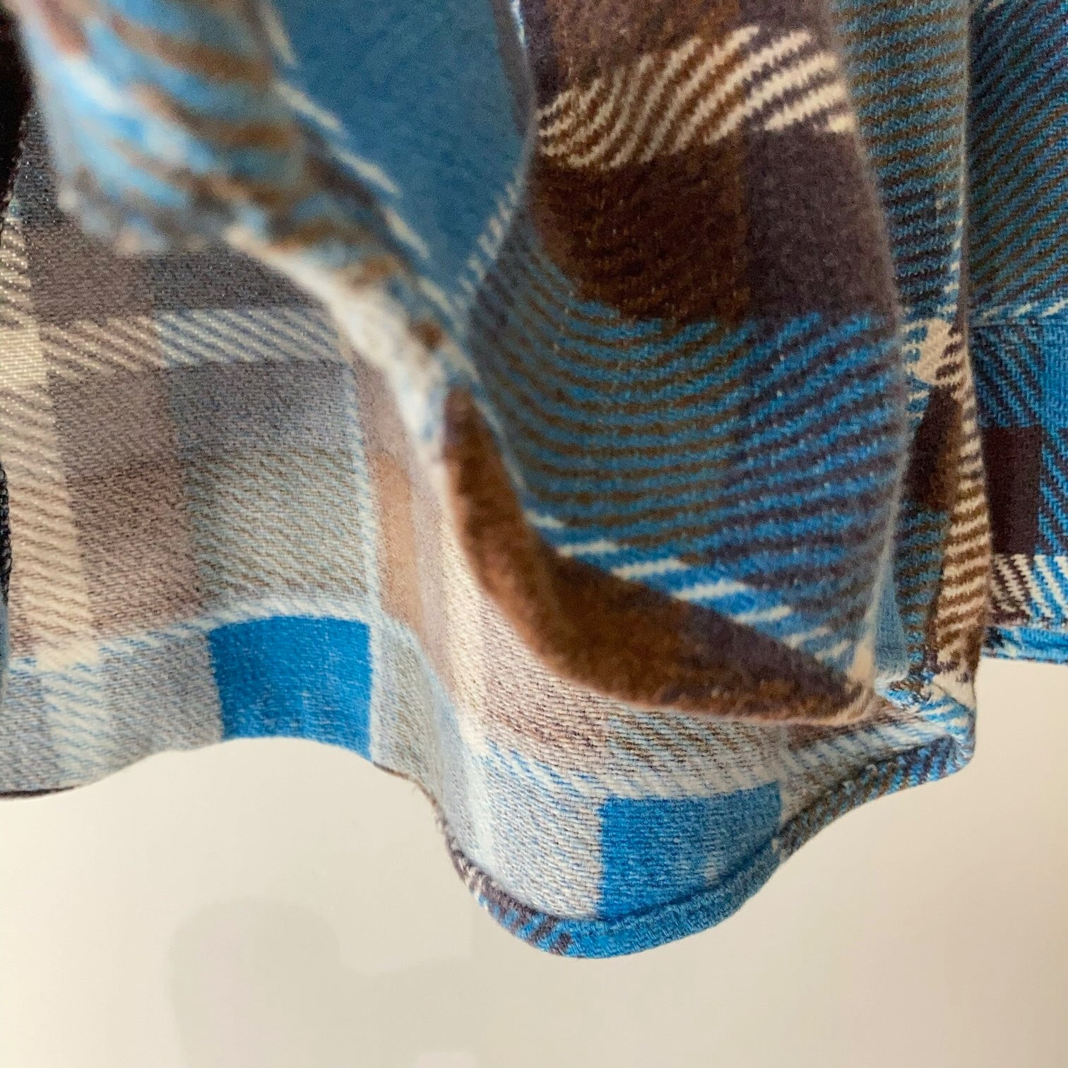 ブルー系とブラウン系の見事なチェックの配色は暖色、寒色どちらにも合わせることが可能。