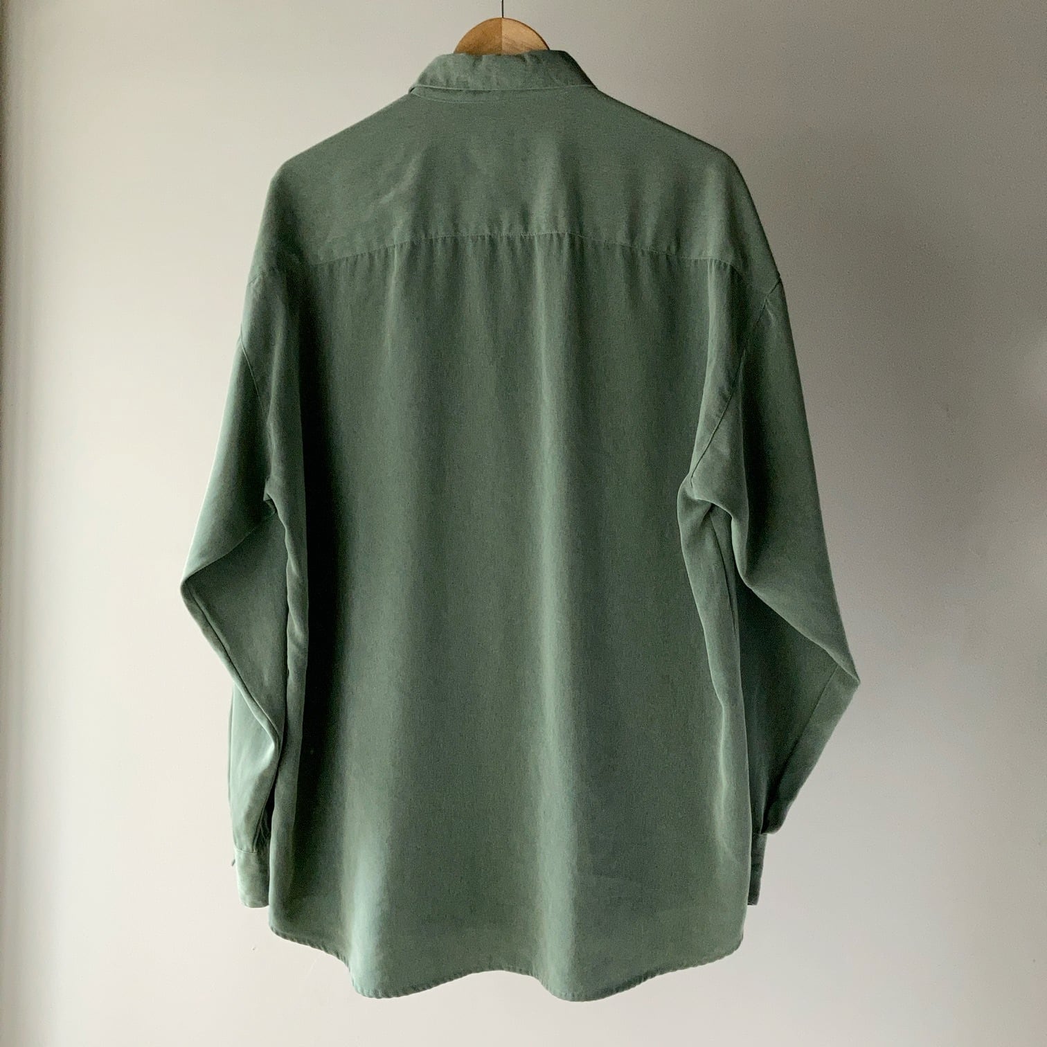 ペールトーンのグリーンが特徴のポリエステルシャツ。