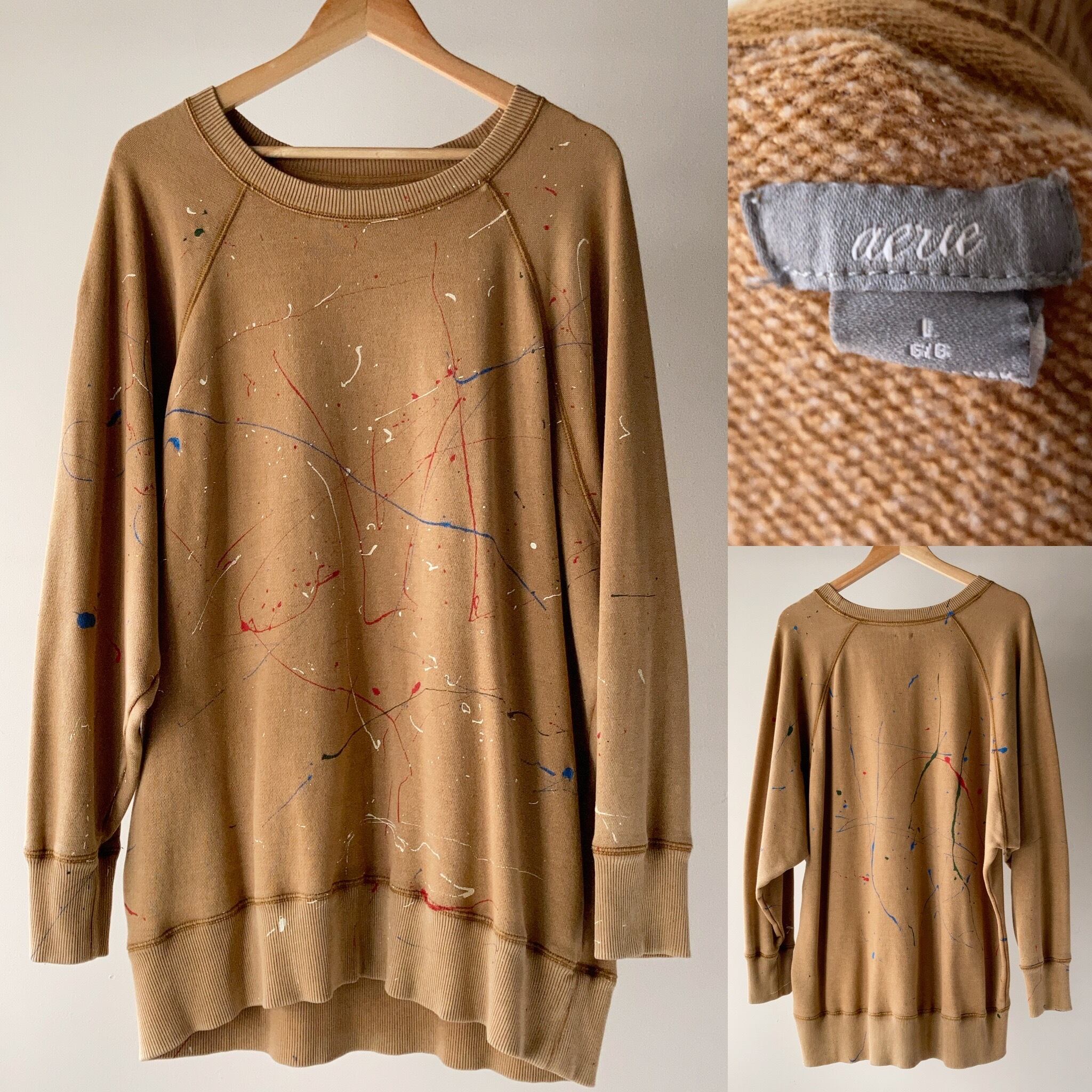 ドルマンスリーブの変形スウェットにペンキカスタムがされた1着。