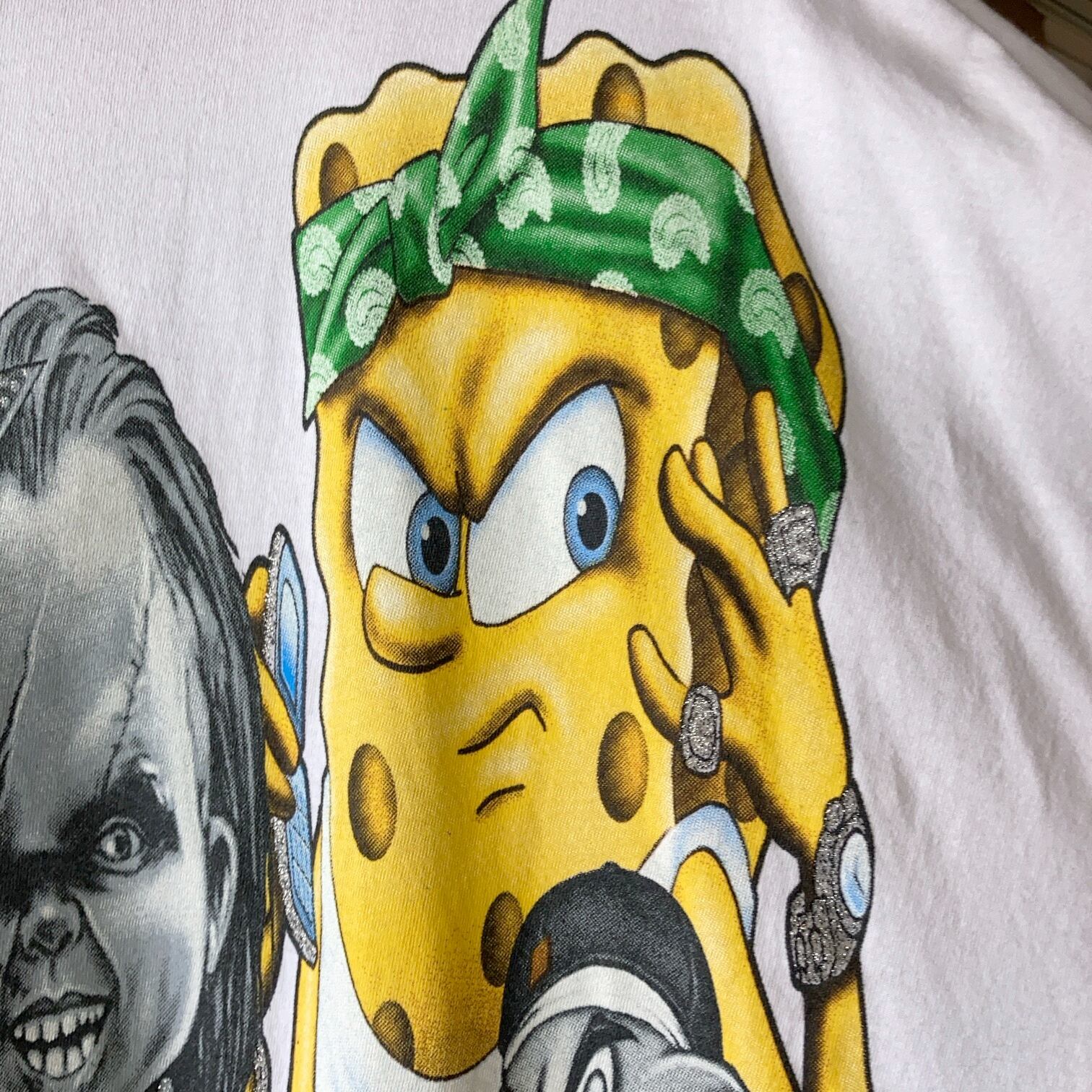 チャッキー、ルーニーテューンズ、スポンジボブ、ポパイがゴリゴリのヒップホップスタイルとなっているプリント。