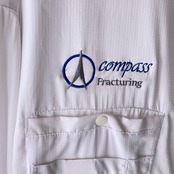 カラーはホワイト。普通の白シャツとは違い、ポリエステル生地でカジュアルなアイテムなので綺麗すぎない印象となります。ポケットが多く非常に便利。