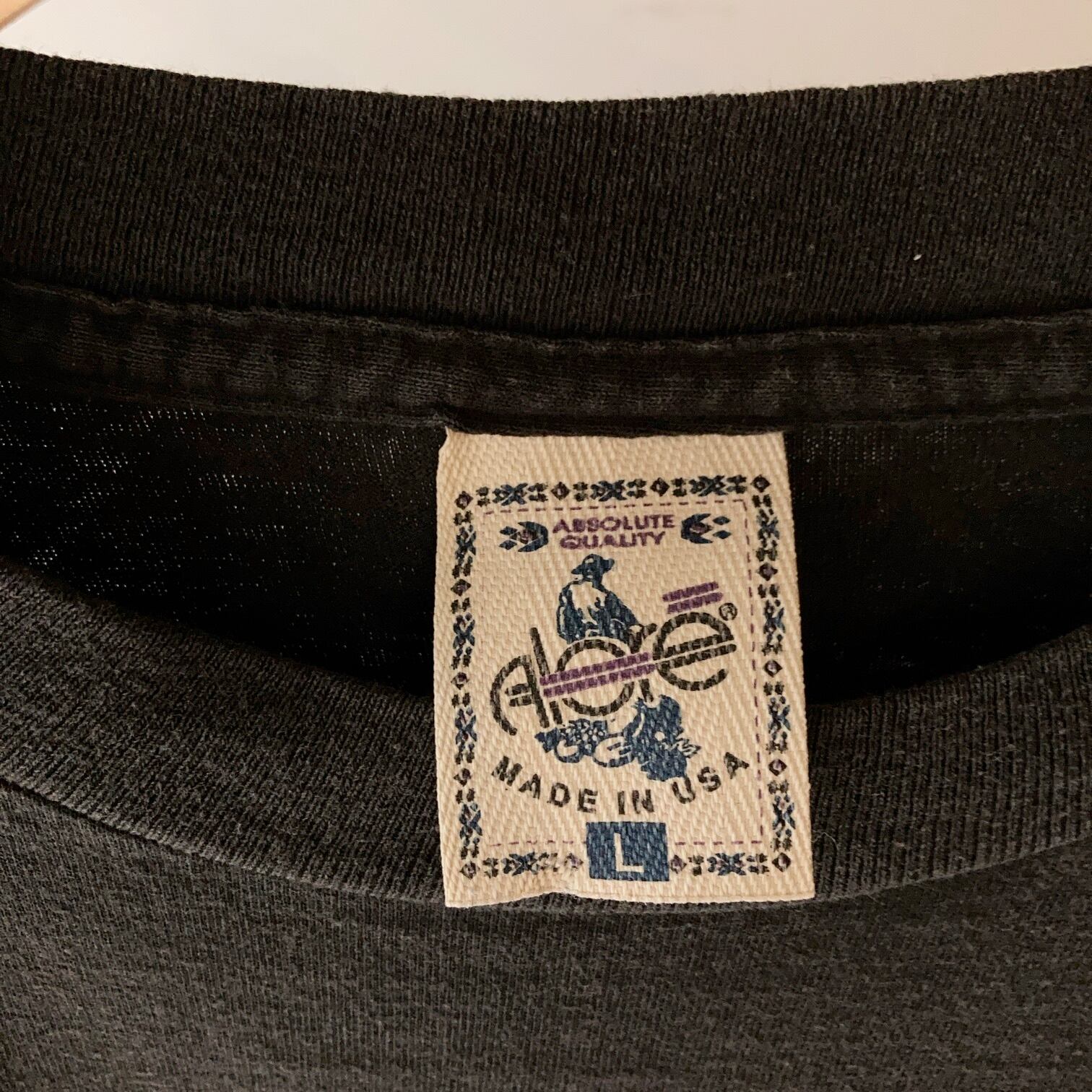 こちらのTシャツはやや色落ちしたスミクロカラーで、かなりお洒落なフォントを使ったプリントteeとなります。