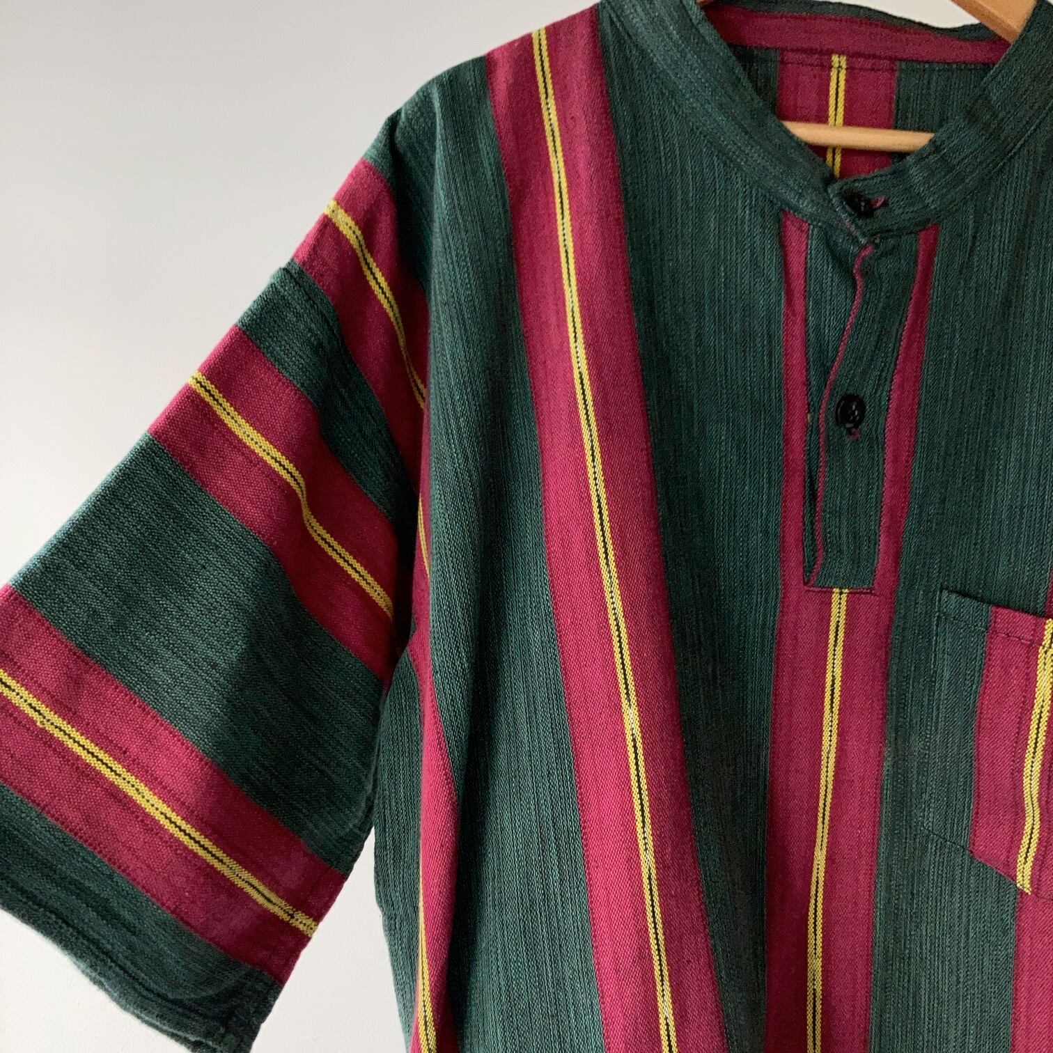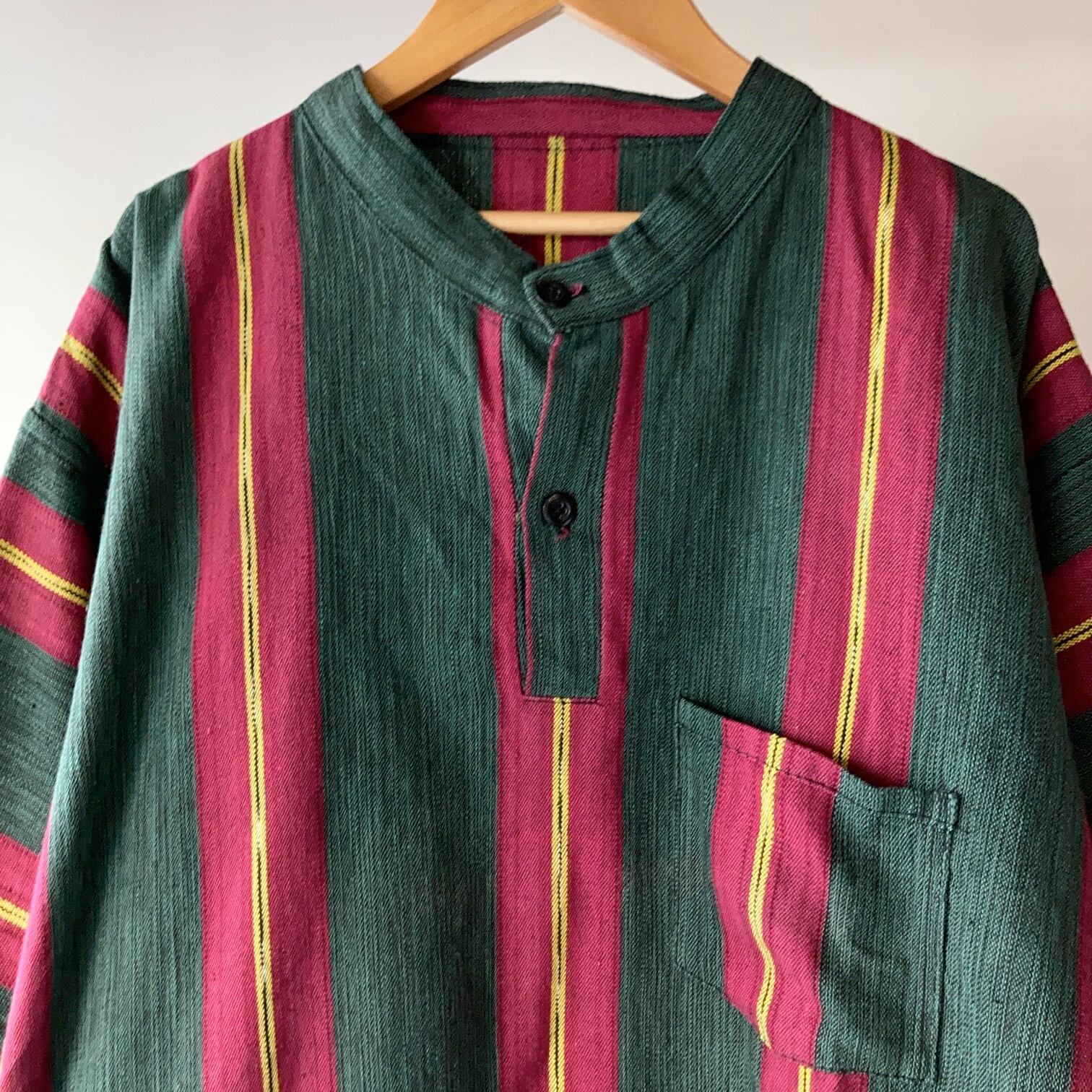 デザイン性が高いバンドカラーかつプルオーバーのユニークなシャツ。