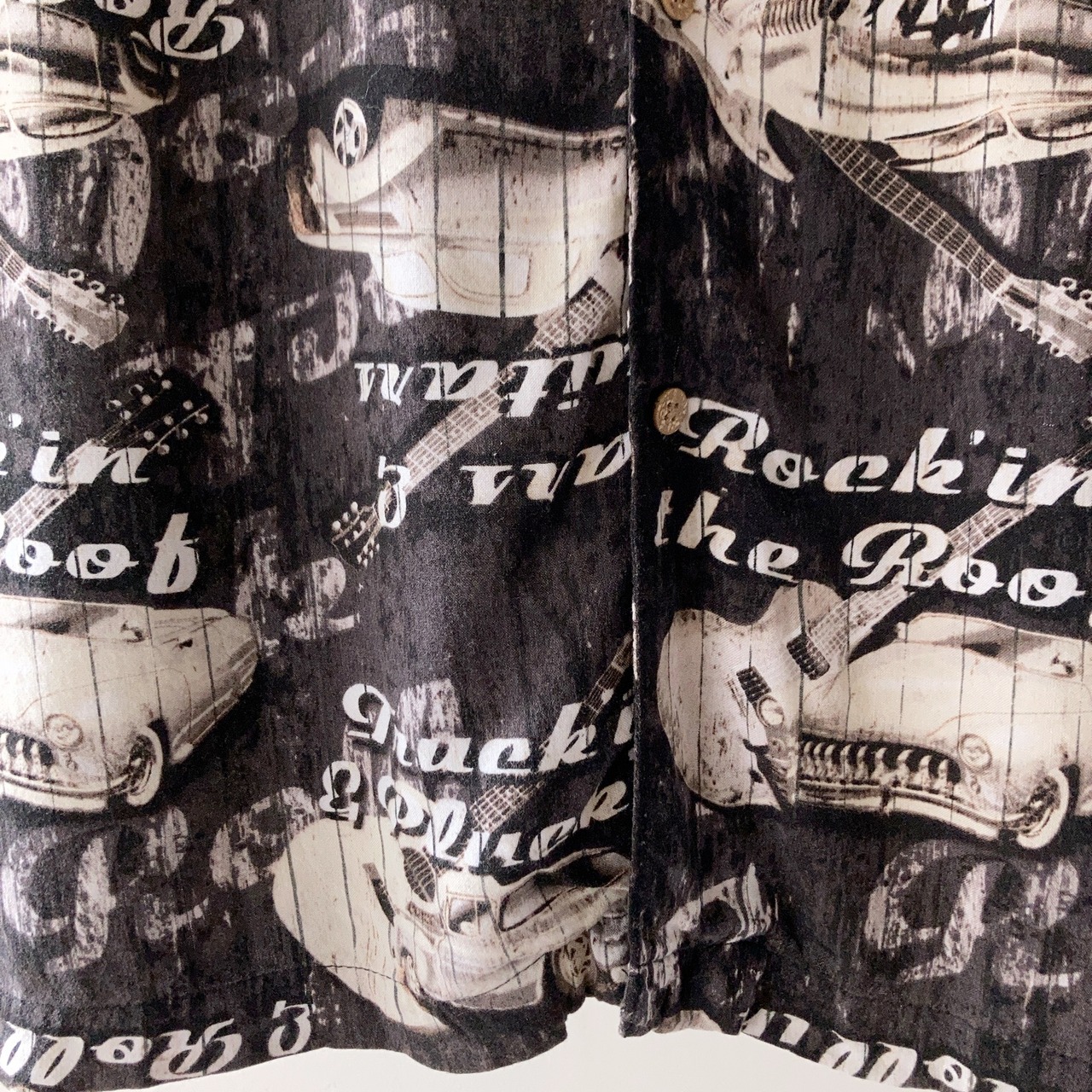 クラシックカーとギターが総柄となっている夏らしいレーヨンシャツ。