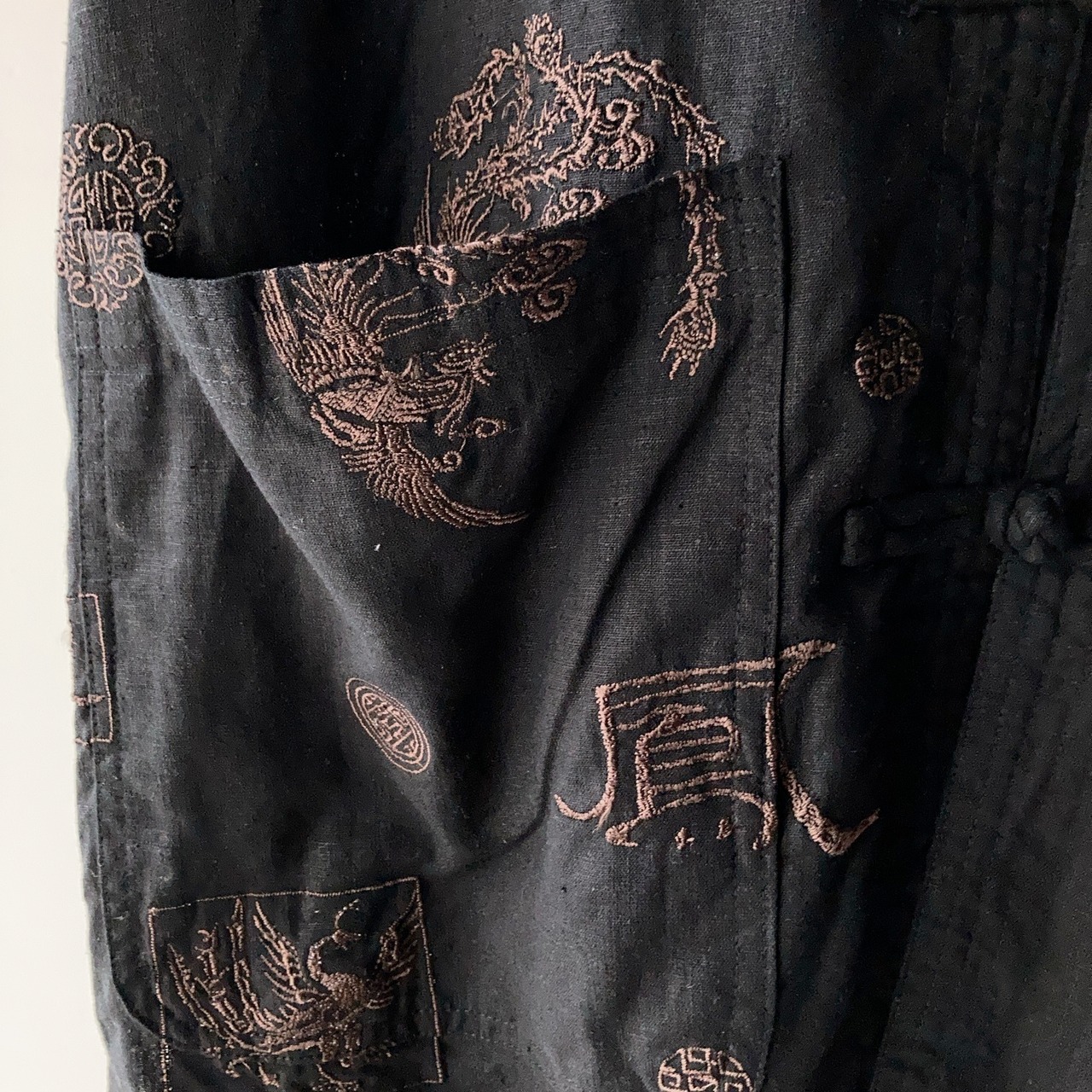 ブラックリネンが使われた刺繍入りチャイナシャツ。