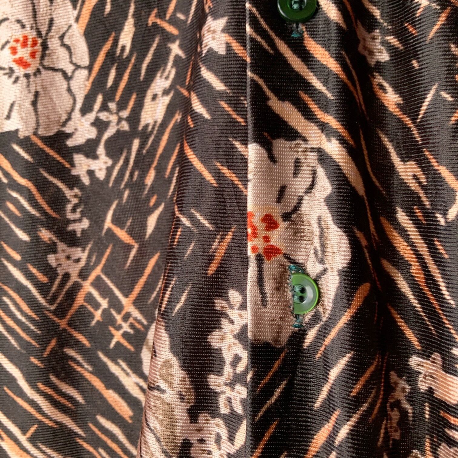 花柄なのにどこか攻撃的。光沢感のあるポリエステル生地で厳つさ倍増。