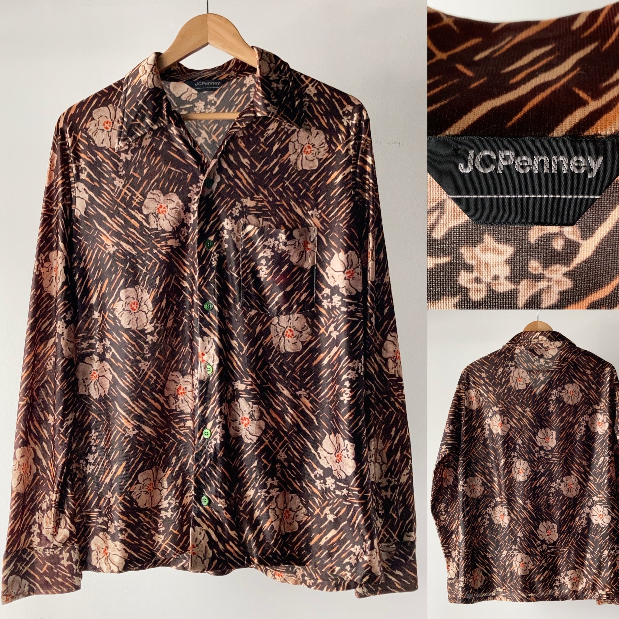 1970's~ JCPenney 総柄ポリエステル L/Sシャツ ダークブラウン【0730A03】