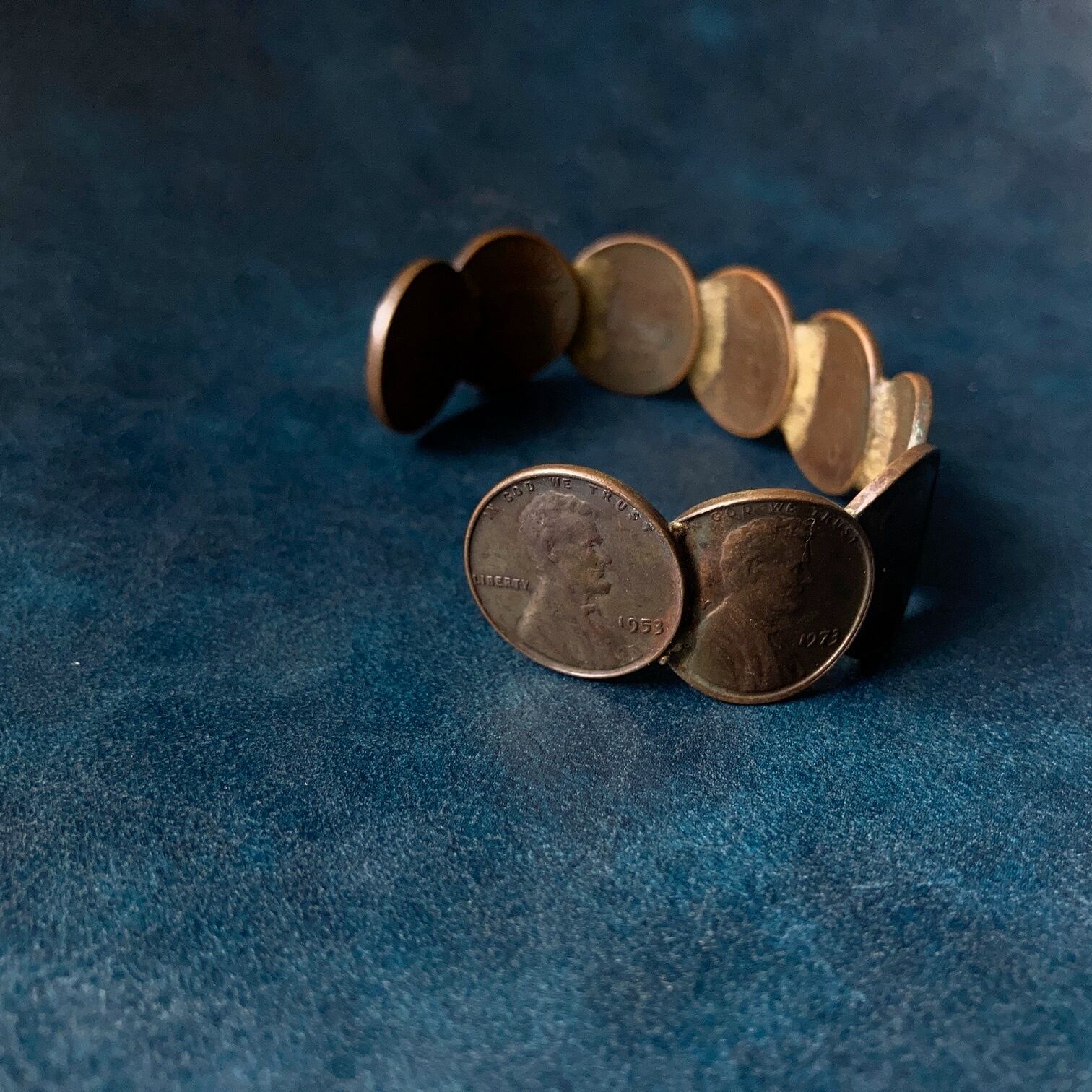 こちらは1944年から1980年までの古い1セント硬貨を繋げて作られたコインバングル。