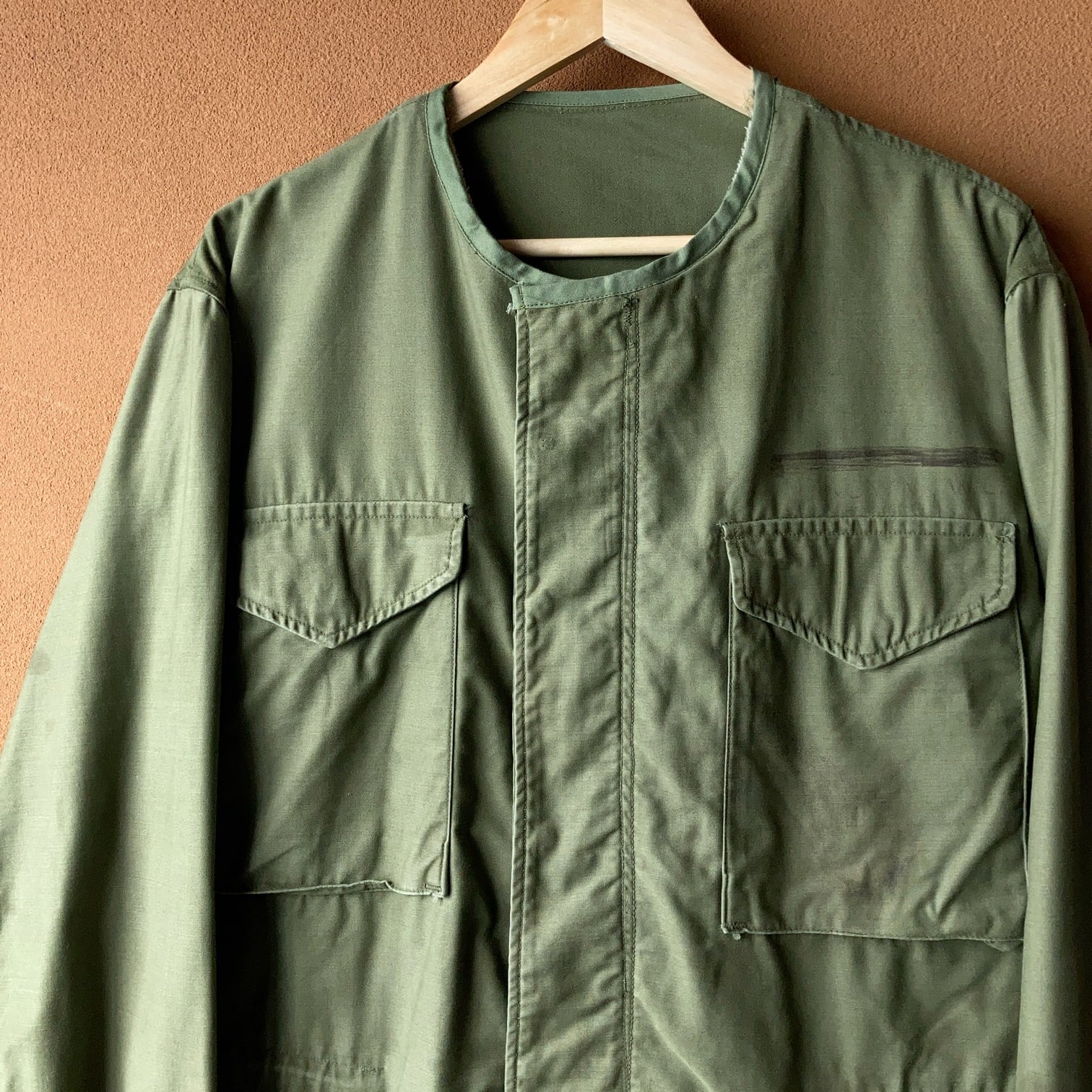 1960年代のアメリカ軍M-65フィールドジャケット1stモデルの襟がノーカラーにカスタマイズされた1着。M-65フィールドジャケットの最初期にだけ存在するエポレットが付かない激レア1stタイプ。