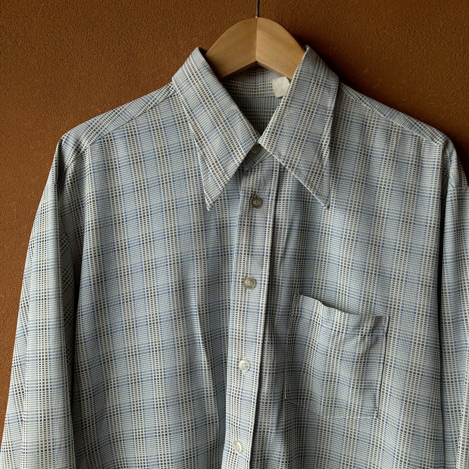 70年代らしい尖った襟と50~70年代に多く見られるボックスシルエットの仕様が混ざったビンテージシャツ。細かいチェック柄入り。