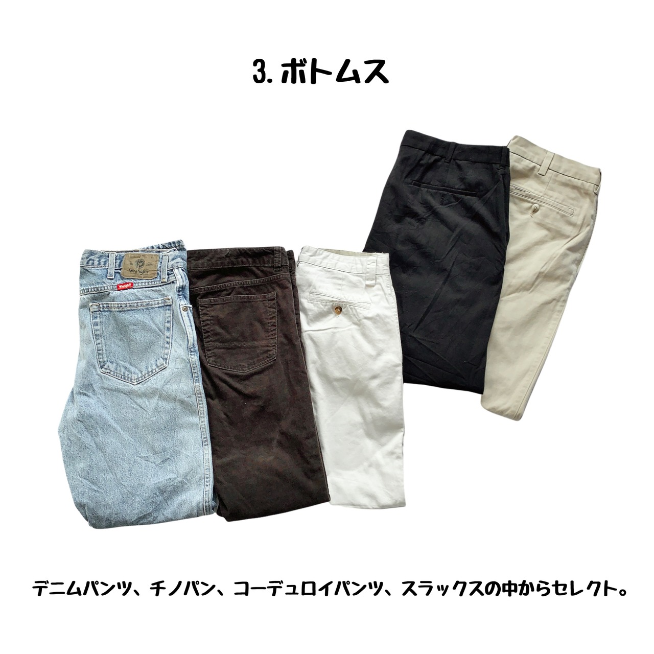 ・ボトムス(チノパン、スラックス、コーデュロイパンツ、デニムパンツの中から1点)