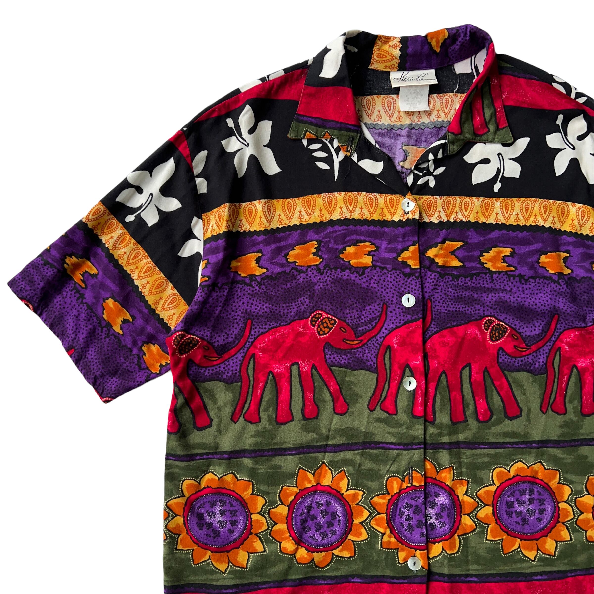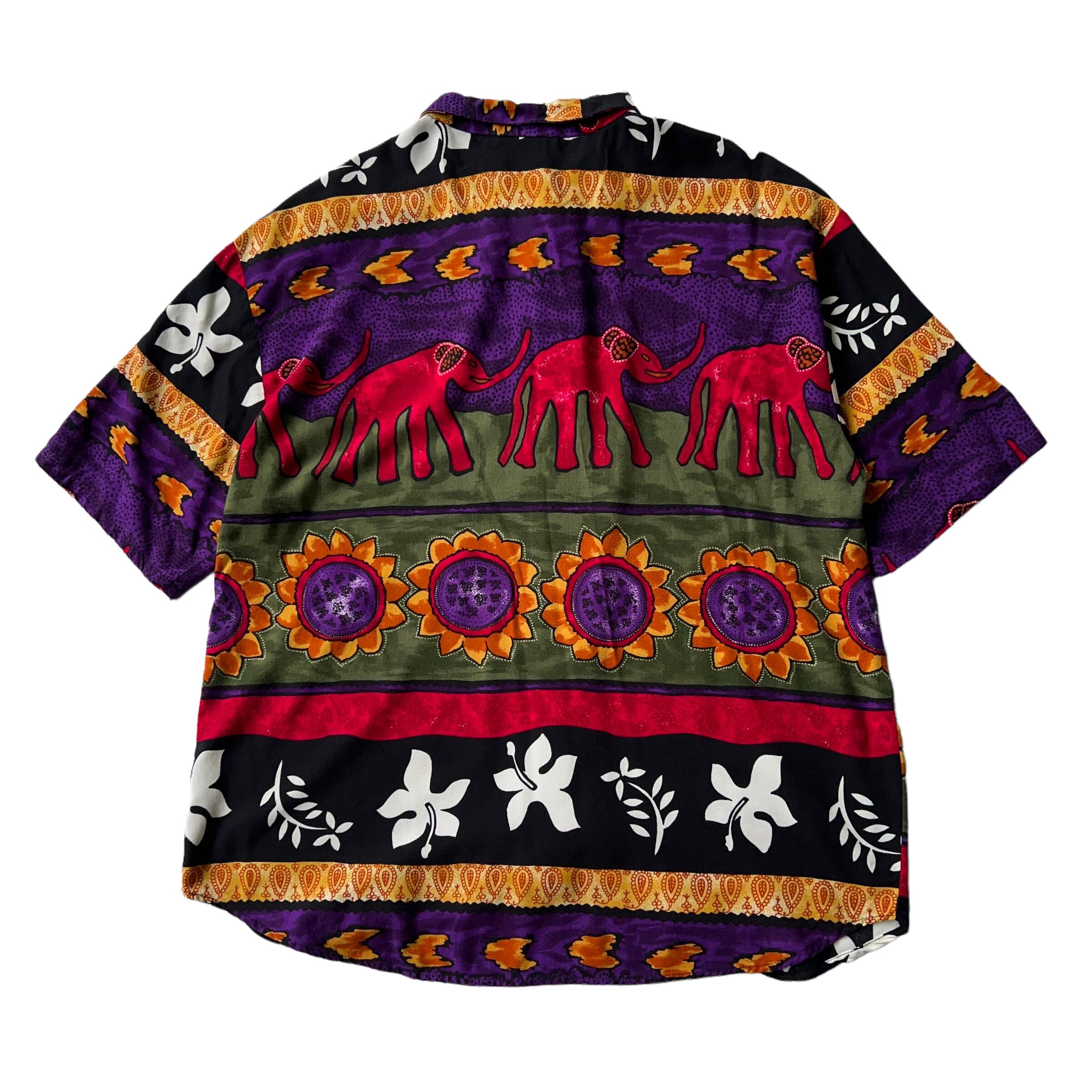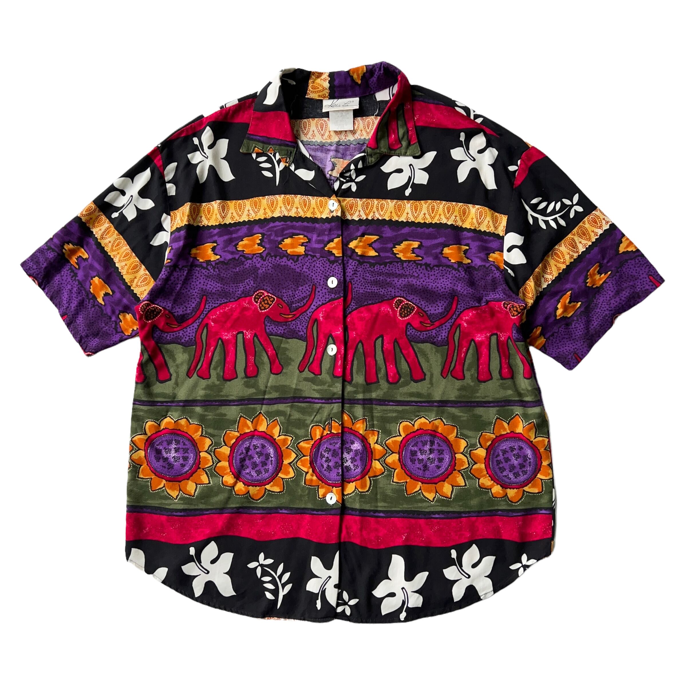 やる気のない絵のタッチのゾウとひまわりがなんとも言えなくて最高。変な柄シャツはバイヤーとしても惹かれます。