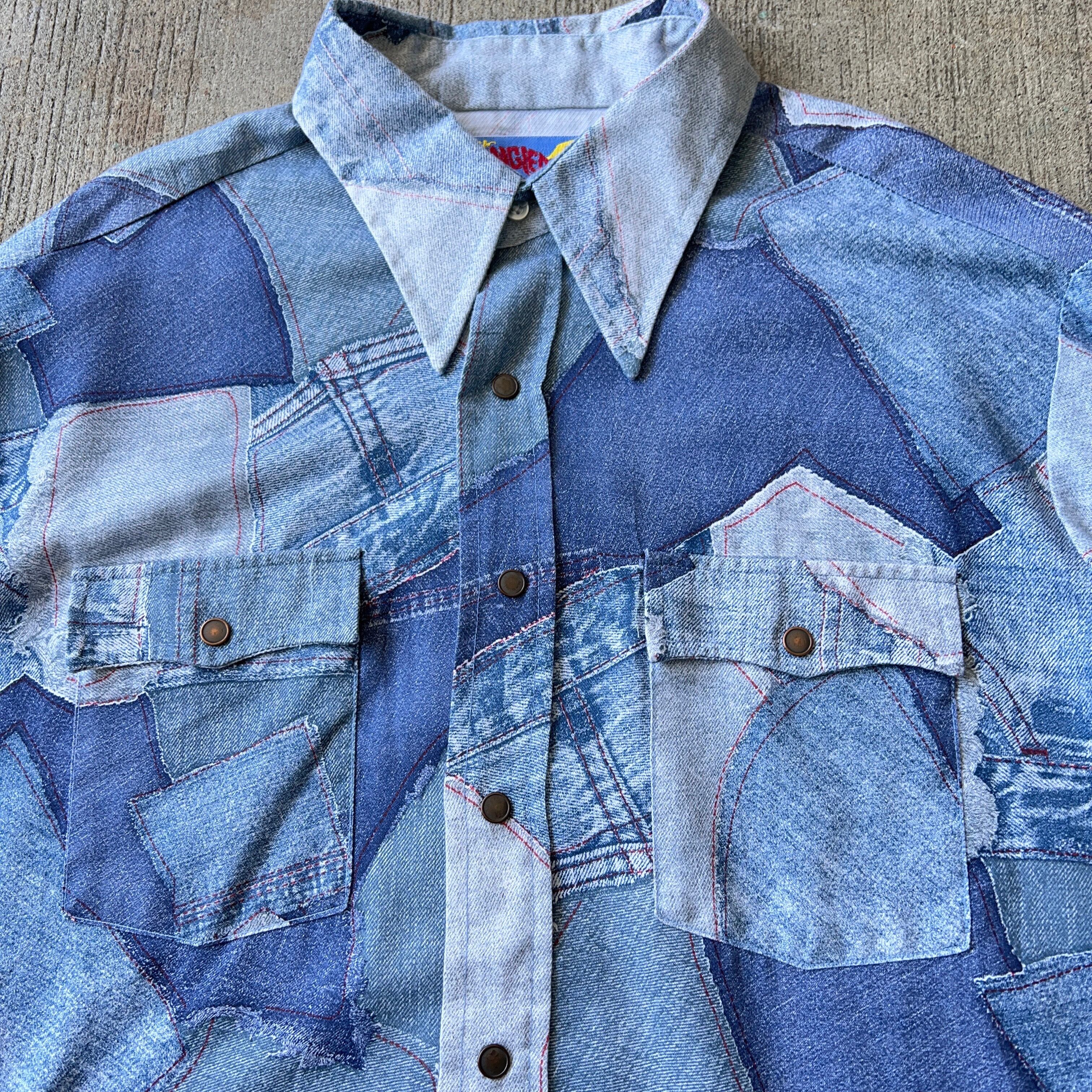 70's Wrangler ウエスタンシャツ デニムパッチワーク風 暴れ馬タグ【0701A153】【送料無料】