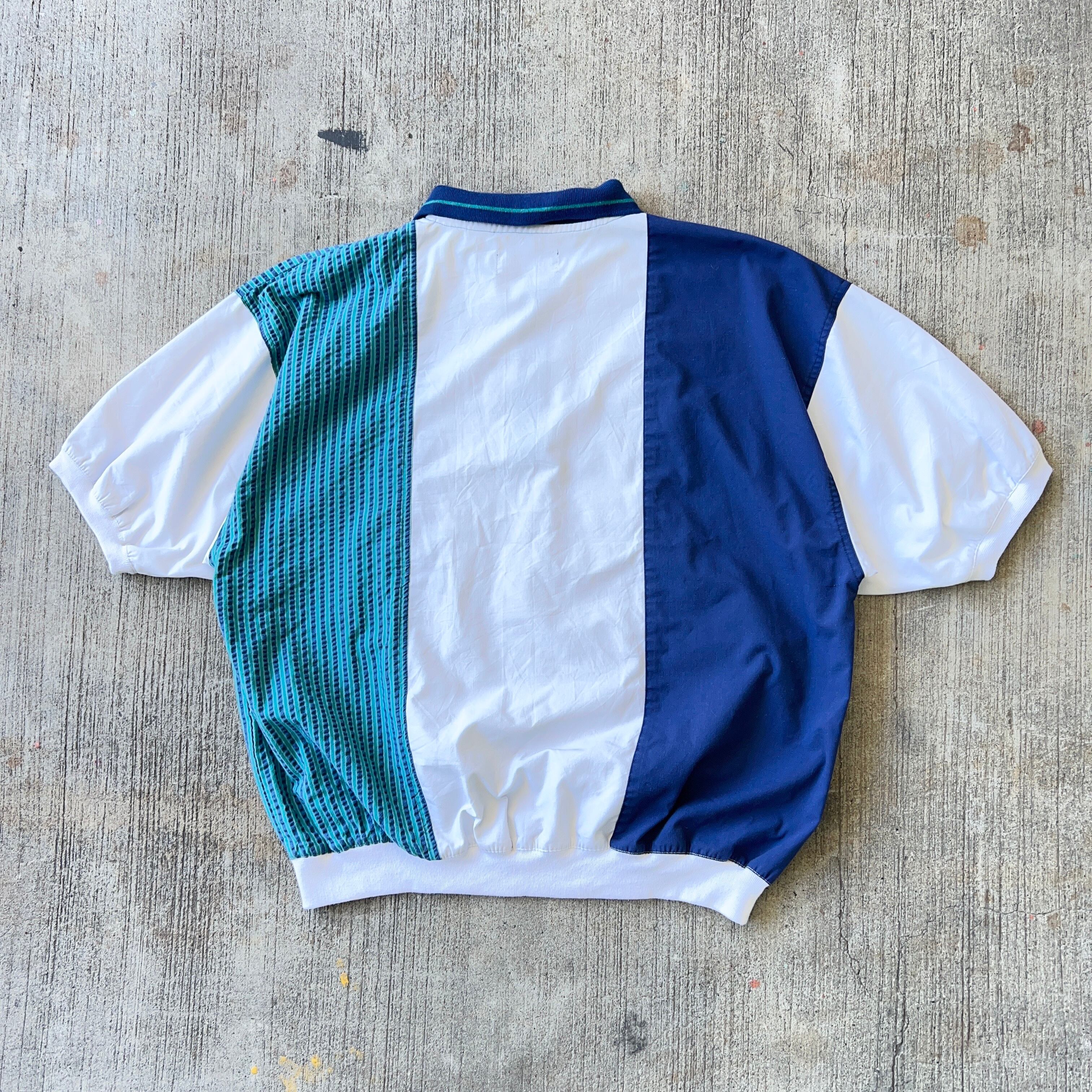 フランスのブランドPierre Cardinのデザインプルオーバーシャツ。アシンメトリーに切り替えが入ったデザインがとてもオシャレ。夏らしくシアサッカー生地も使われています。