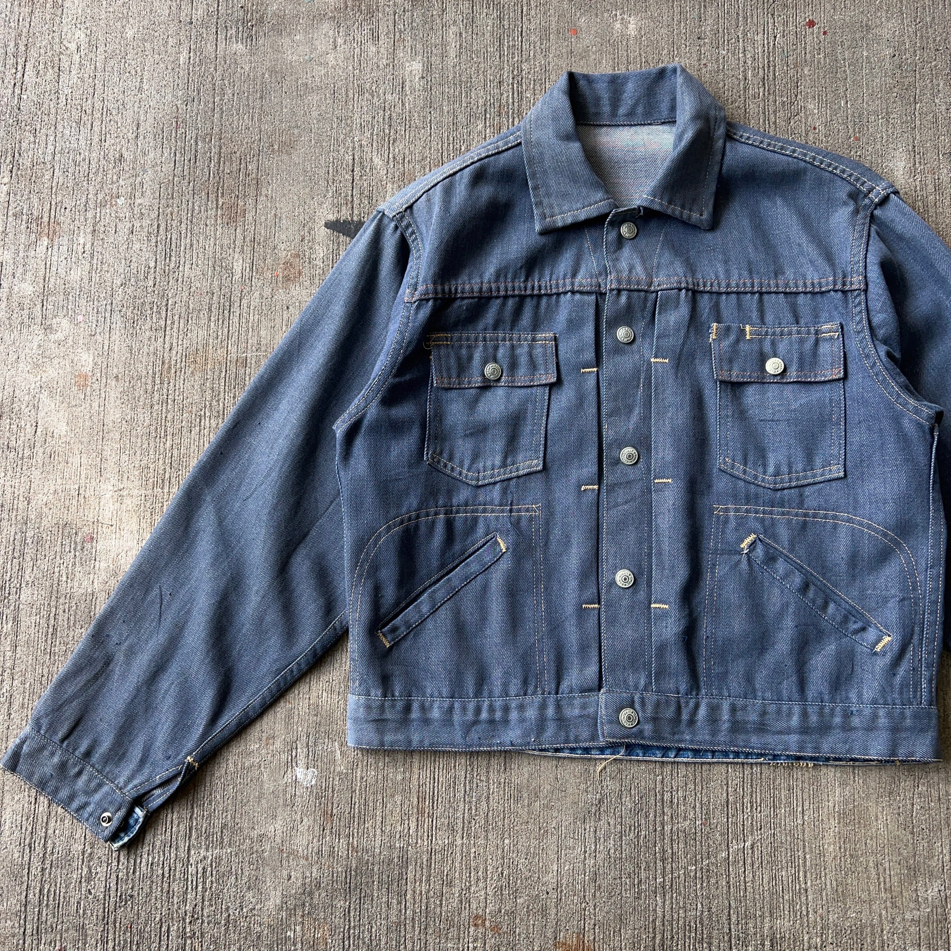 ビンテージデニムジャケットといえばプリーツ仕様。4ポケット付き。ボタンはスナップ仕様。