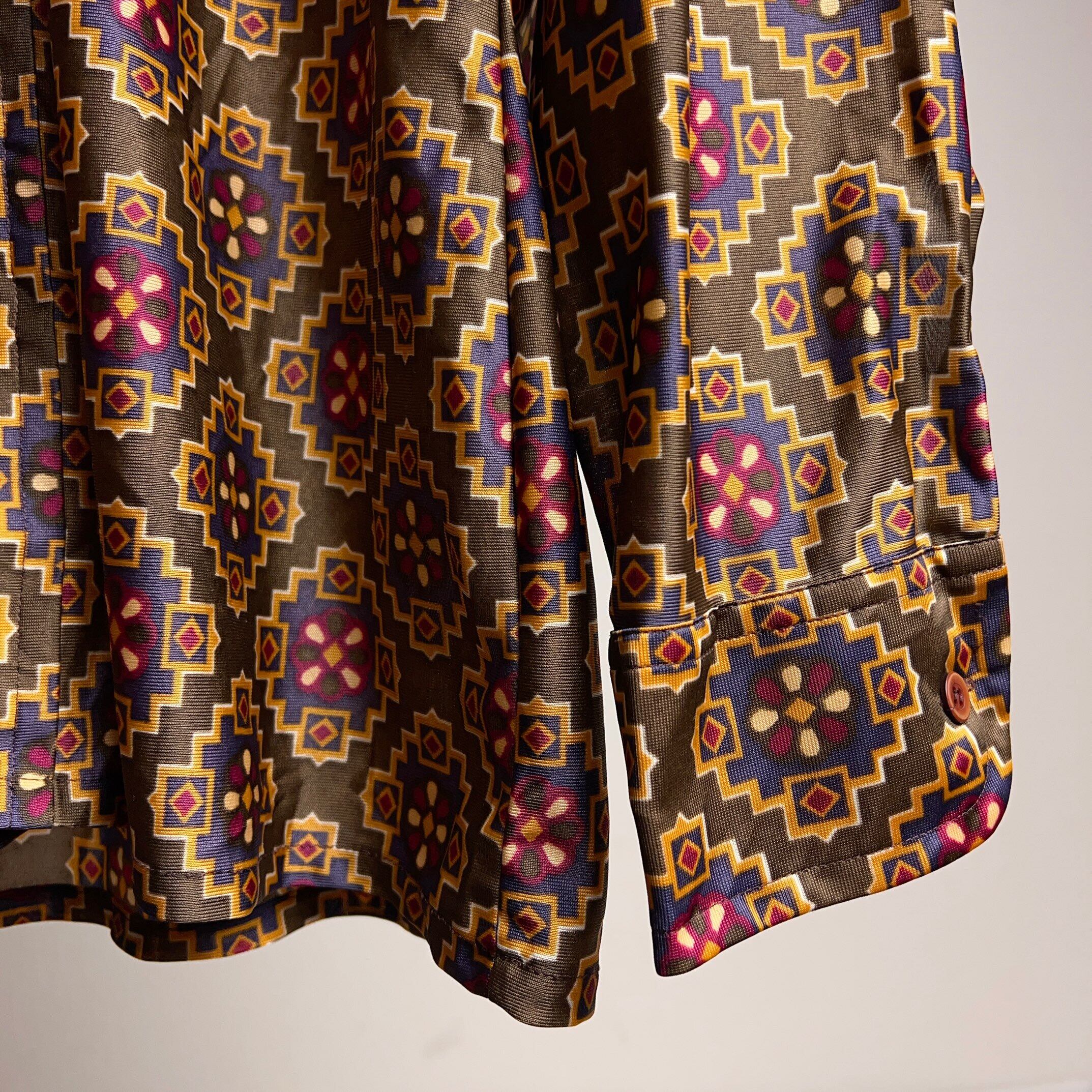 こちらはビンテージブランドで人気が高いARROWのポリシャツ。渋いダークブラウンの総柄パターン。70'sスタイルとの相性が抜群に良いです。
