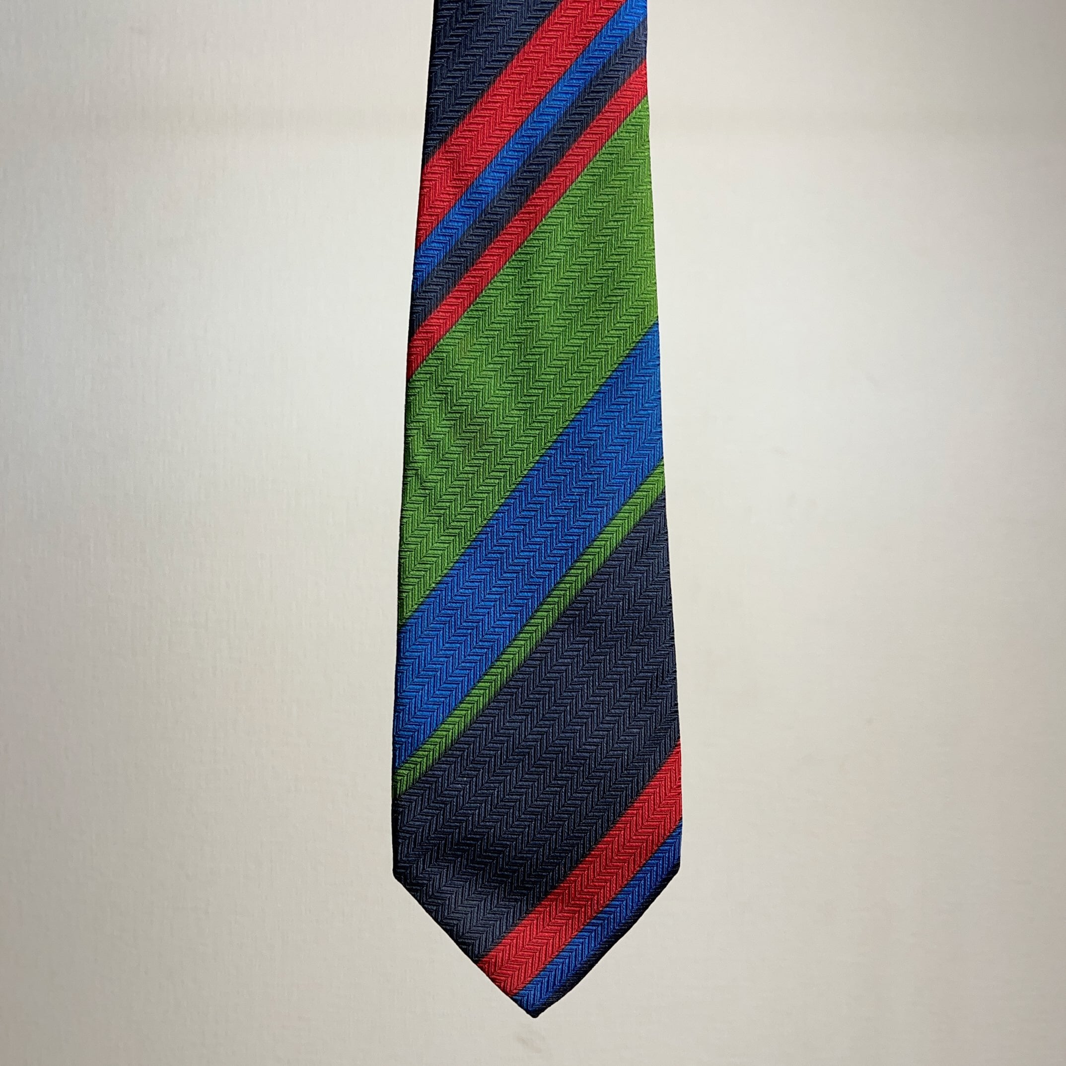ハイブランドYves Saint Laurent(イヴ・サンローラン)のシルクネクタイ。太さの異なるレジメンタルストライプにヘリンボーンツイル。大人のネクタイです。