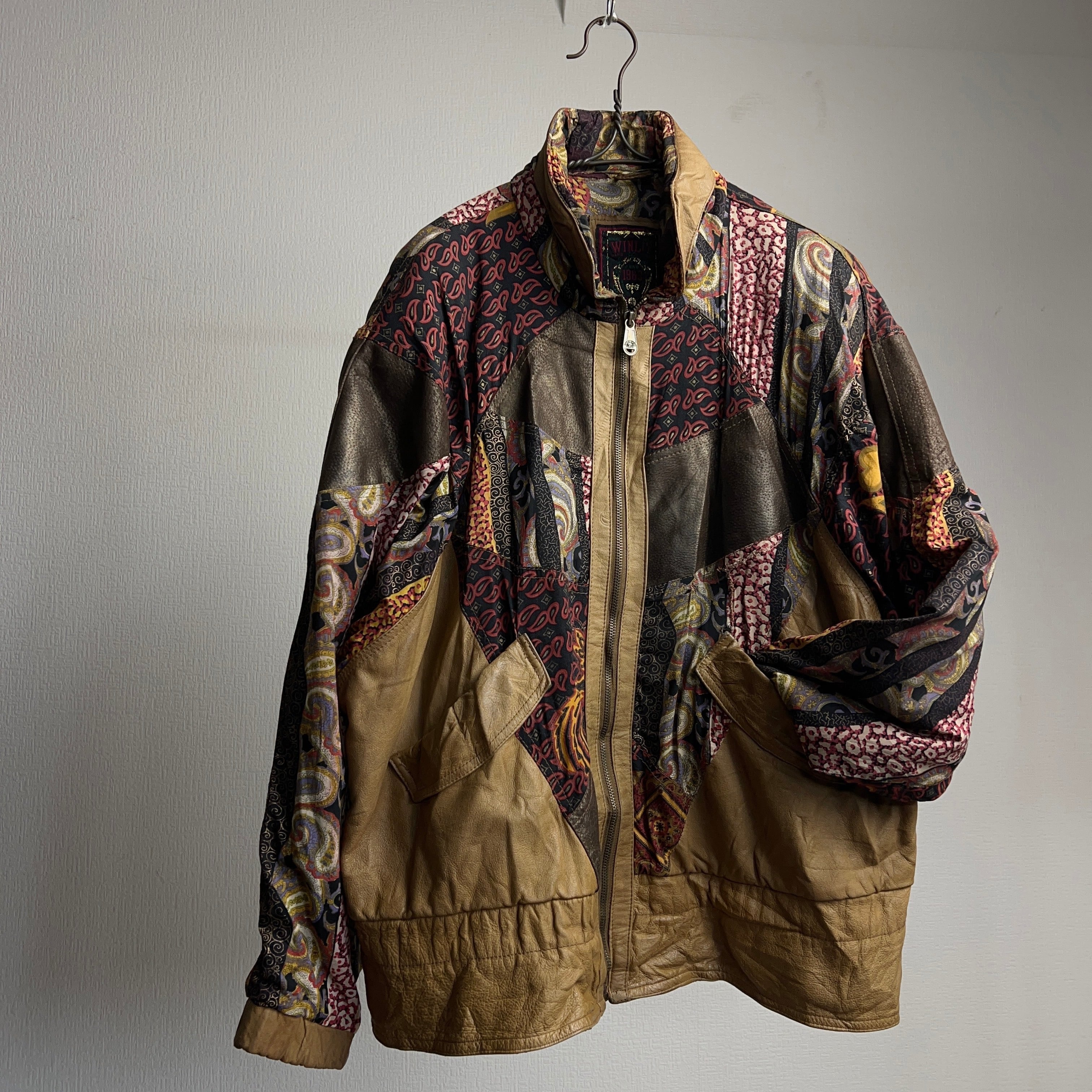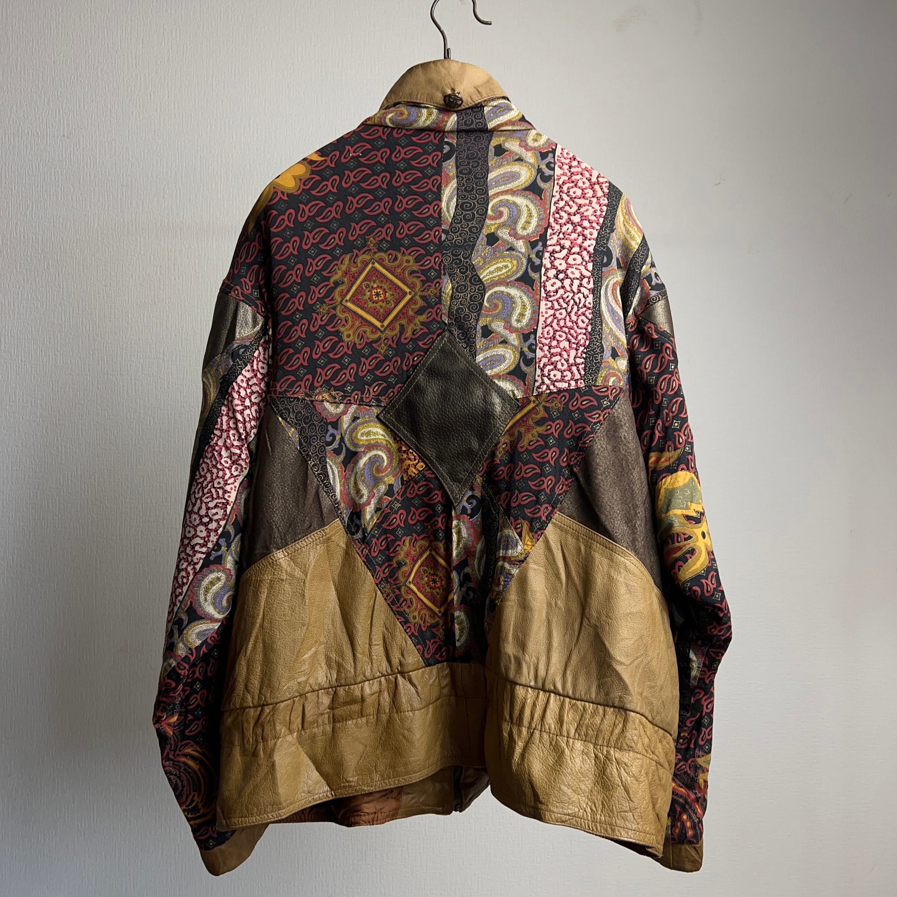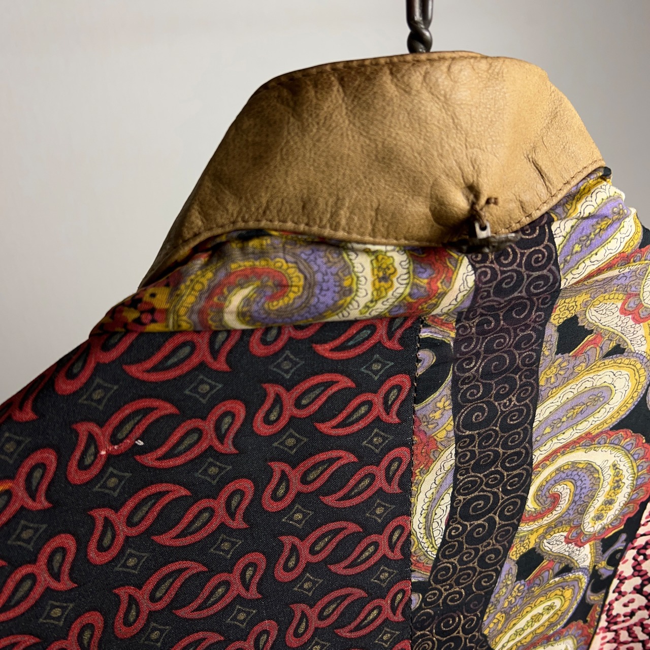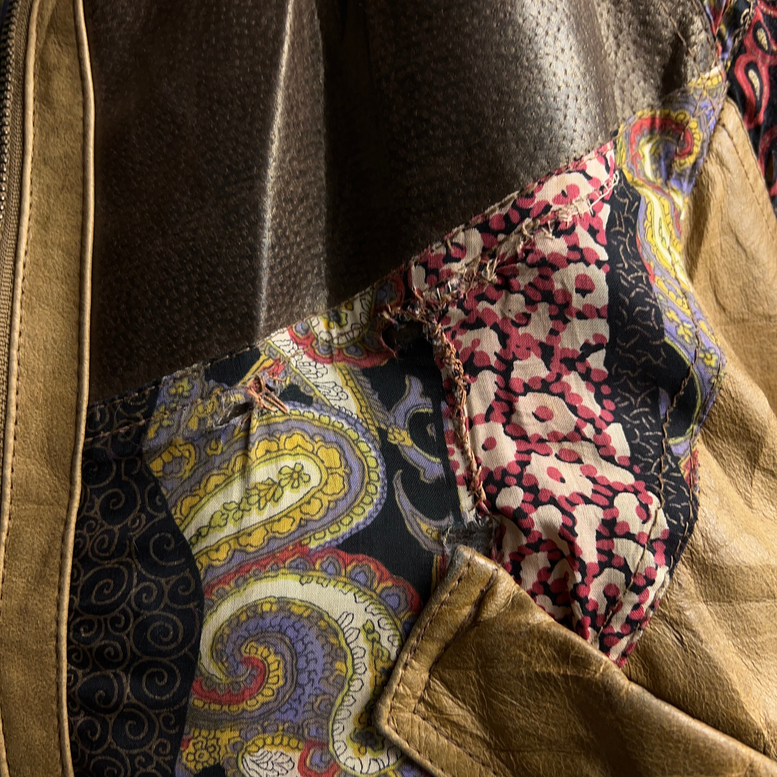 様々な柄の滑らかなコットン生地とレザーをパッチワークで繋ぎ合わせたとてもお洒落なビンテージジャケット。