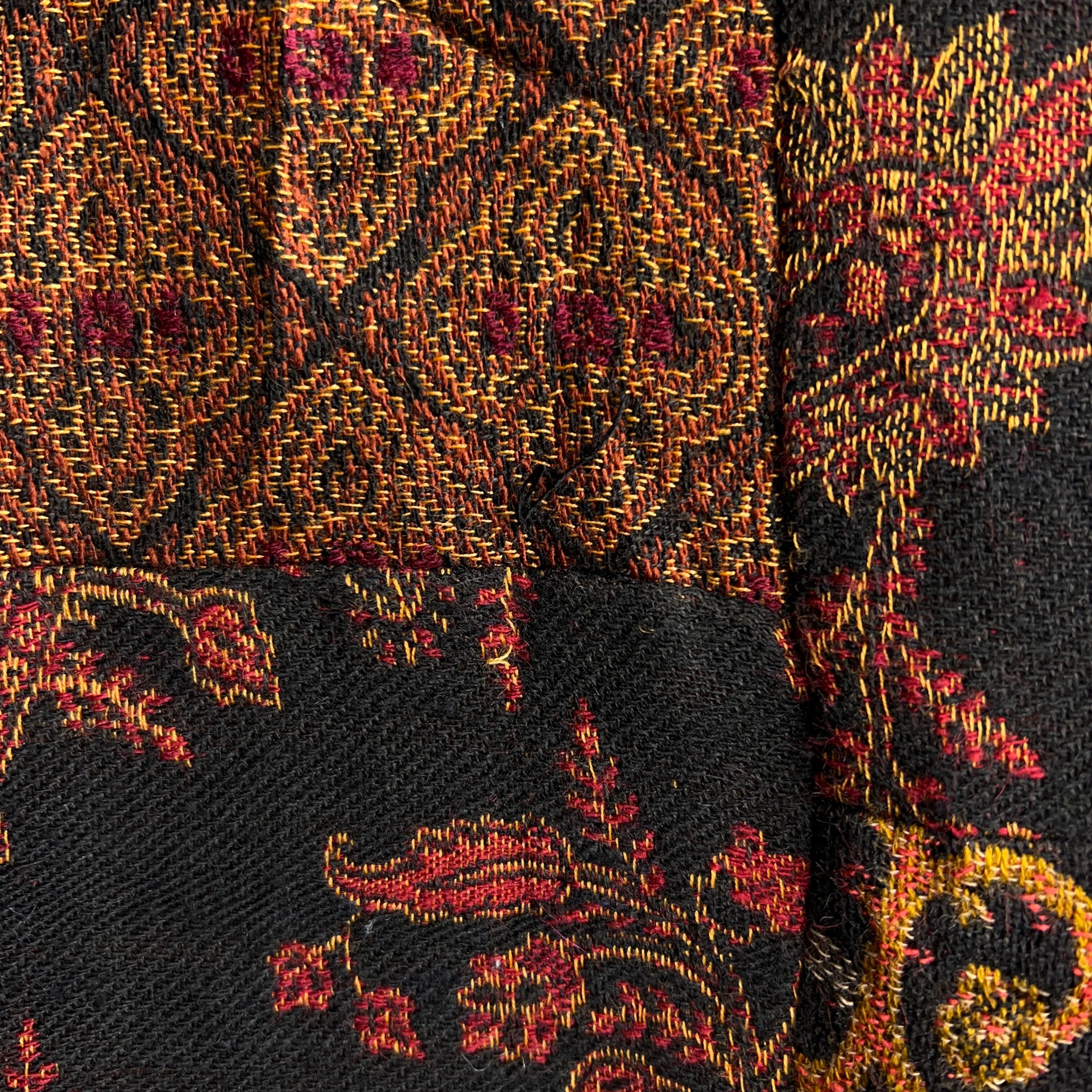 ジャカード織のさまざまな民族柄の生地をパッチワークで繋ぎ合わせたチャイナジャケット。