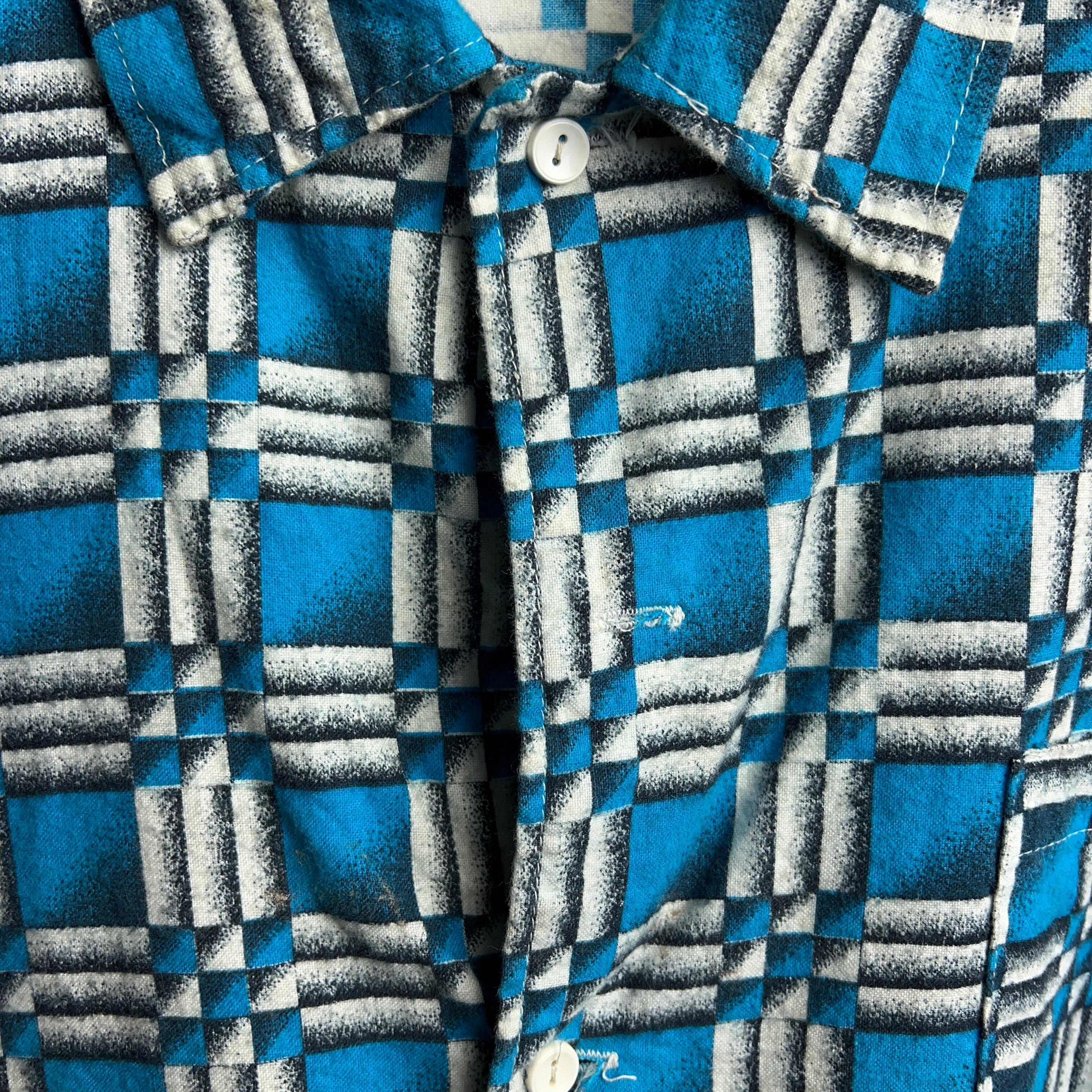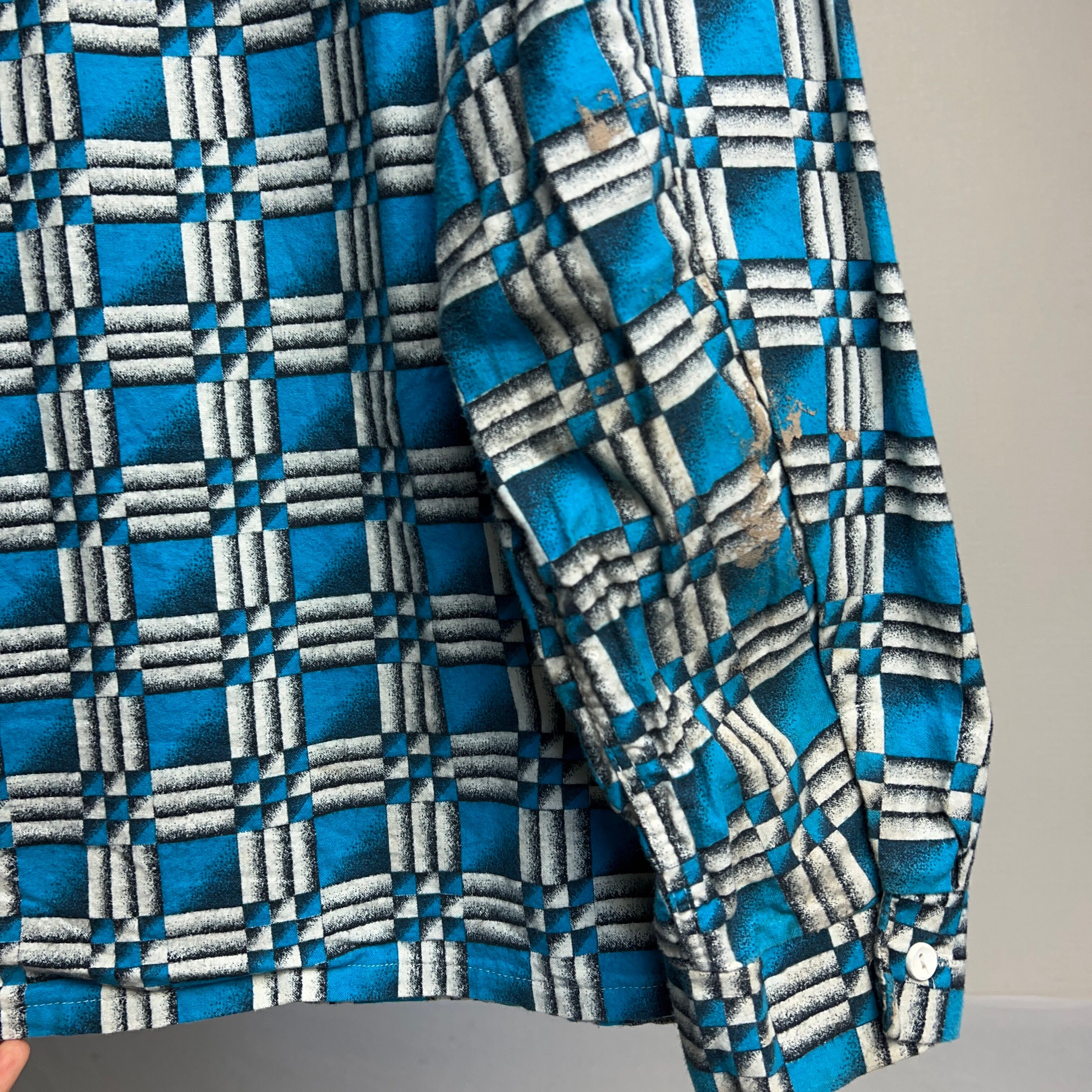 アメリカ物にはない幾何学的な総柄のプリントネルシャツ。