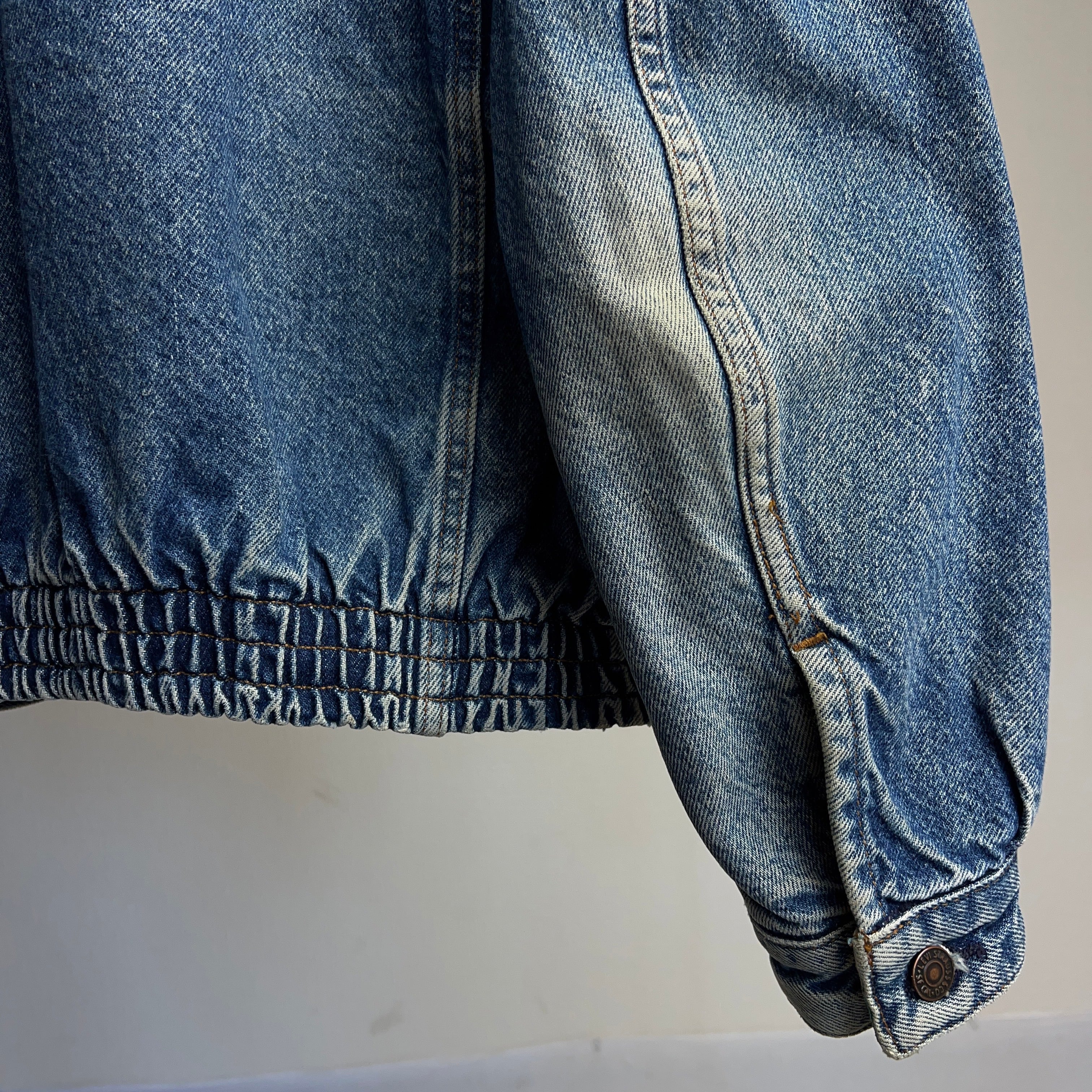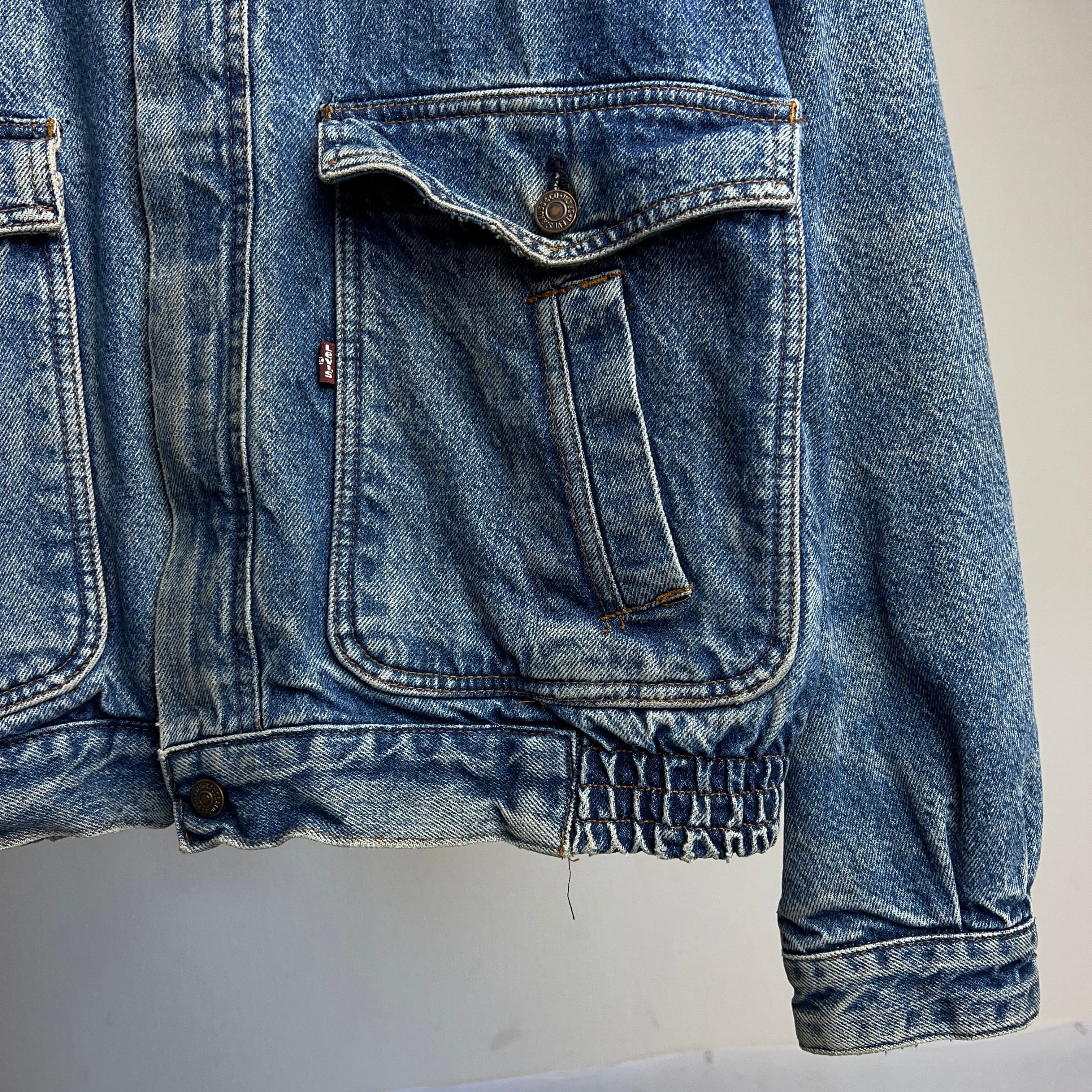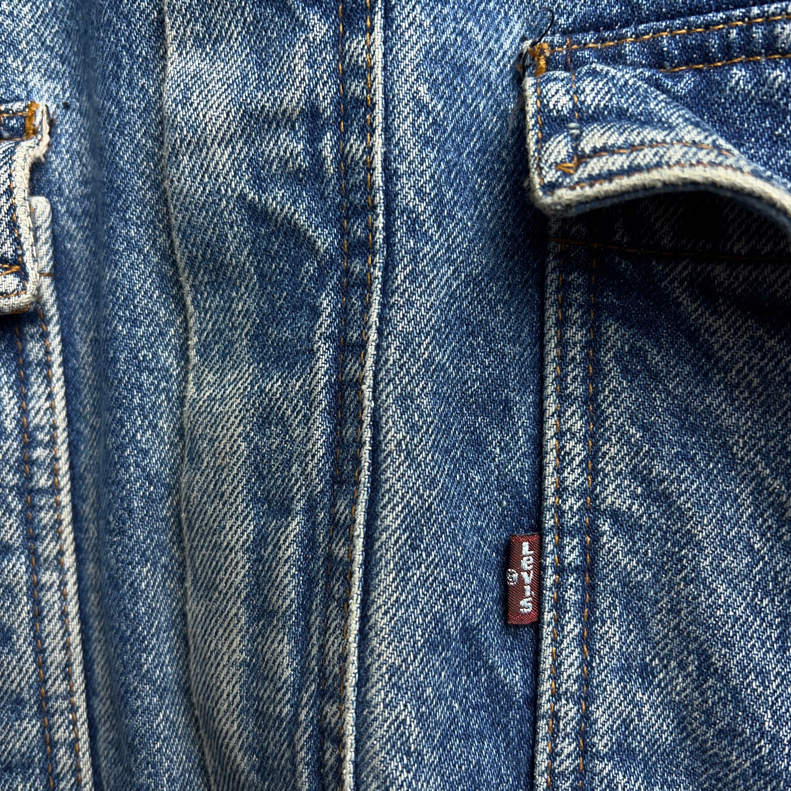 90年代リーバイスの超でかいタグ(11cm×15cm)通称"デカタグ"が取り付けられたビンテージデニムジャケット。