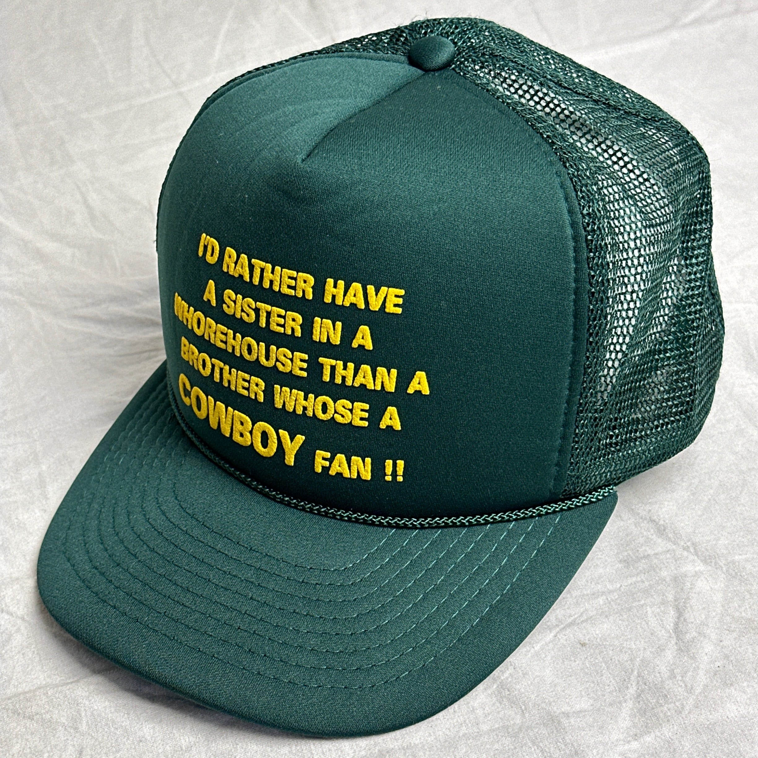 発泡プリントで「I'd rather have a sister in a whorehouse than a brother whose a cowboy fan!! (カウボーイファンの兄より売春婦の妹の方が良い!)と書かれたいかにもアメリカらしいジョーク混じりのキャップです。
