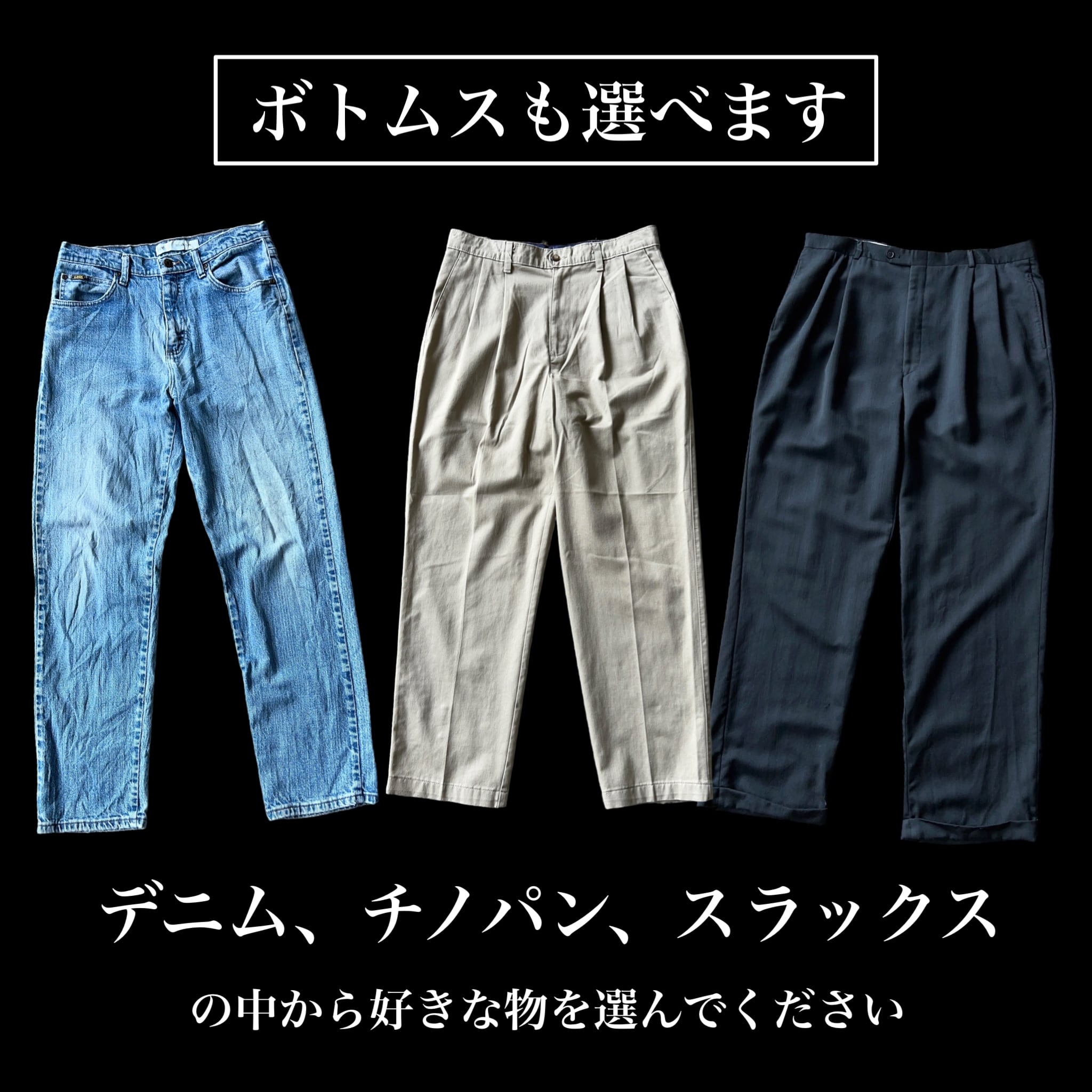 ※もし、持っている色や苦手な色などがあれば外していれることもできますので、備考欄にご記入ください。(シャツは青以外、スラックス茶色以外など。デザインやシルエットの指定はできません。)